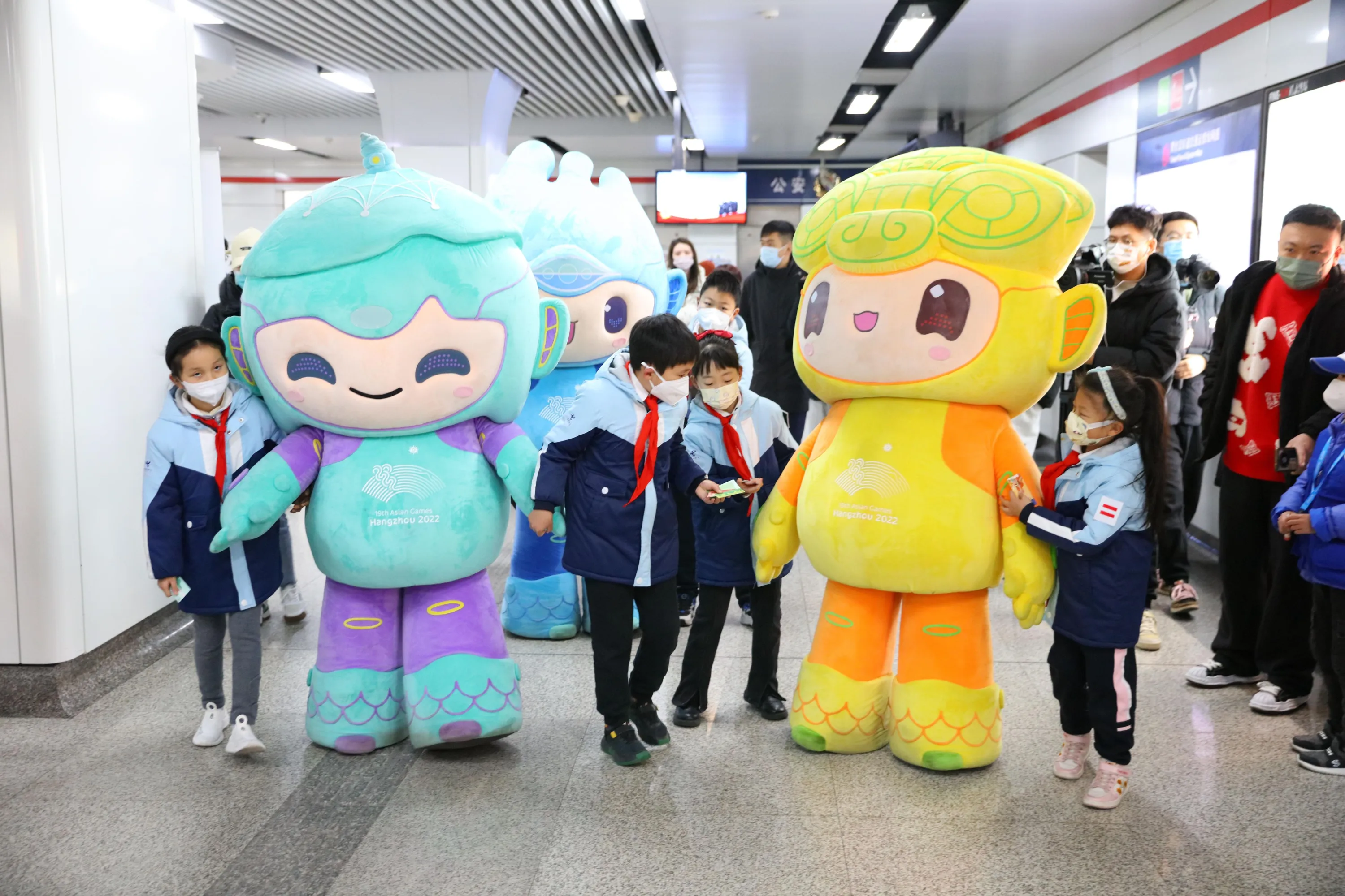 The mascots for the 19th Asian Games Hangzhou 2022 take the subway in Hangzhou City, east China's Zhejiang province, 18 January, 2023. (Photo by Rex Features/Shutterstock)