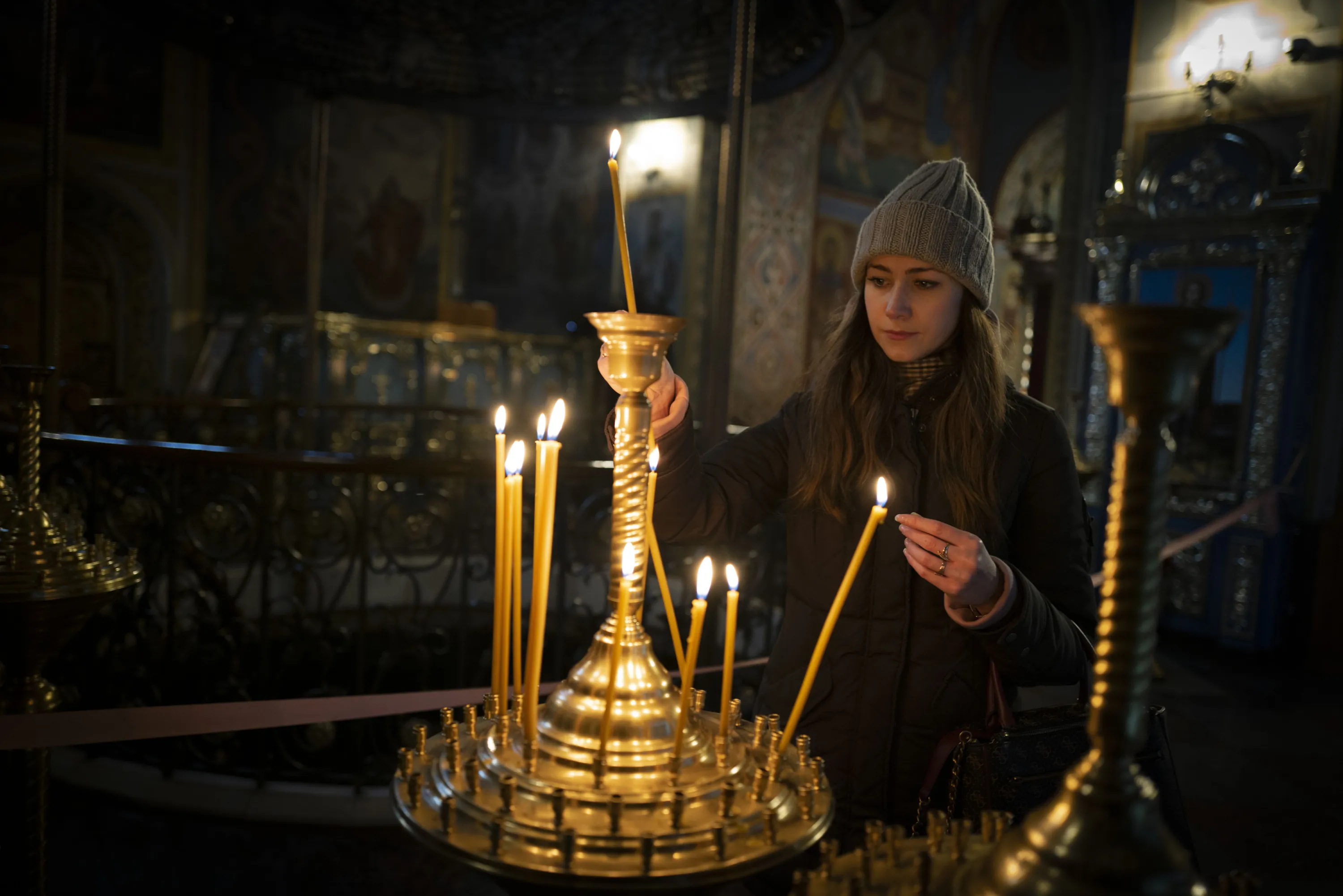 A girl lights a candle before the start of the Orthodox Christmas in the St. Michael's Monastery of Kyiv, Ukraine, Friday, January 6, 2023. Russian President Vladimir Putin on Thursday ordered Moscow's armed forces to observe a 36-hour cease-fire in Ukraine this weekend for the Russian Orthodox Christmas holiday, but Ukrainian President Volodymyr Zelenskyy questioned the Kremlin's intentions. (Photo by Bela Szandelszky/AP Photo)