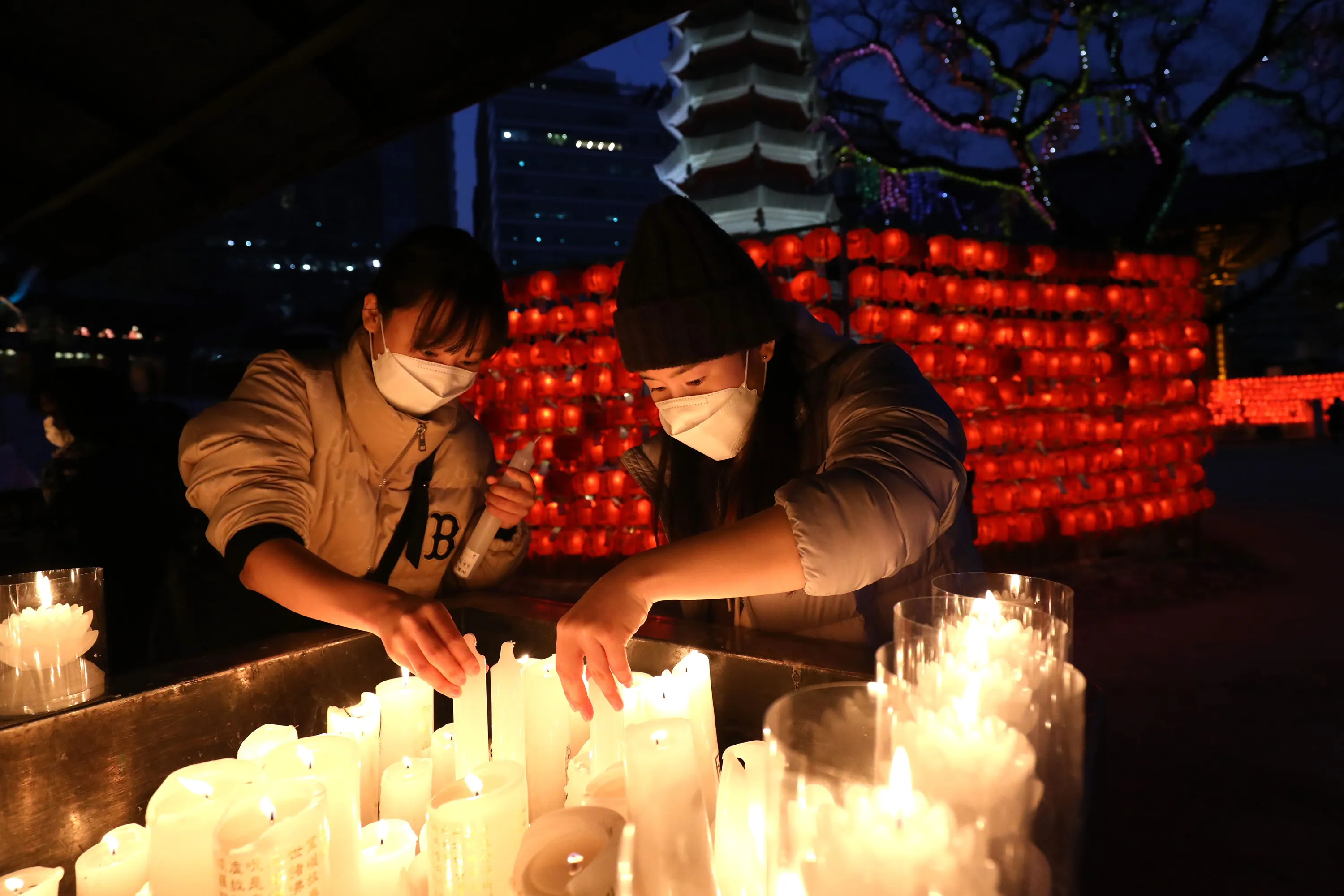 South Koreans light candles at Jogye temple during the New Year Eve on December 31, 2022 in Seoul, South Korea. South Koreans will celebrate in central Seoul after the New Year event was held without an audience for the past three years due to the COVID-19 pandemic. (Photo by Chung Sung-Jun/Getty Images)