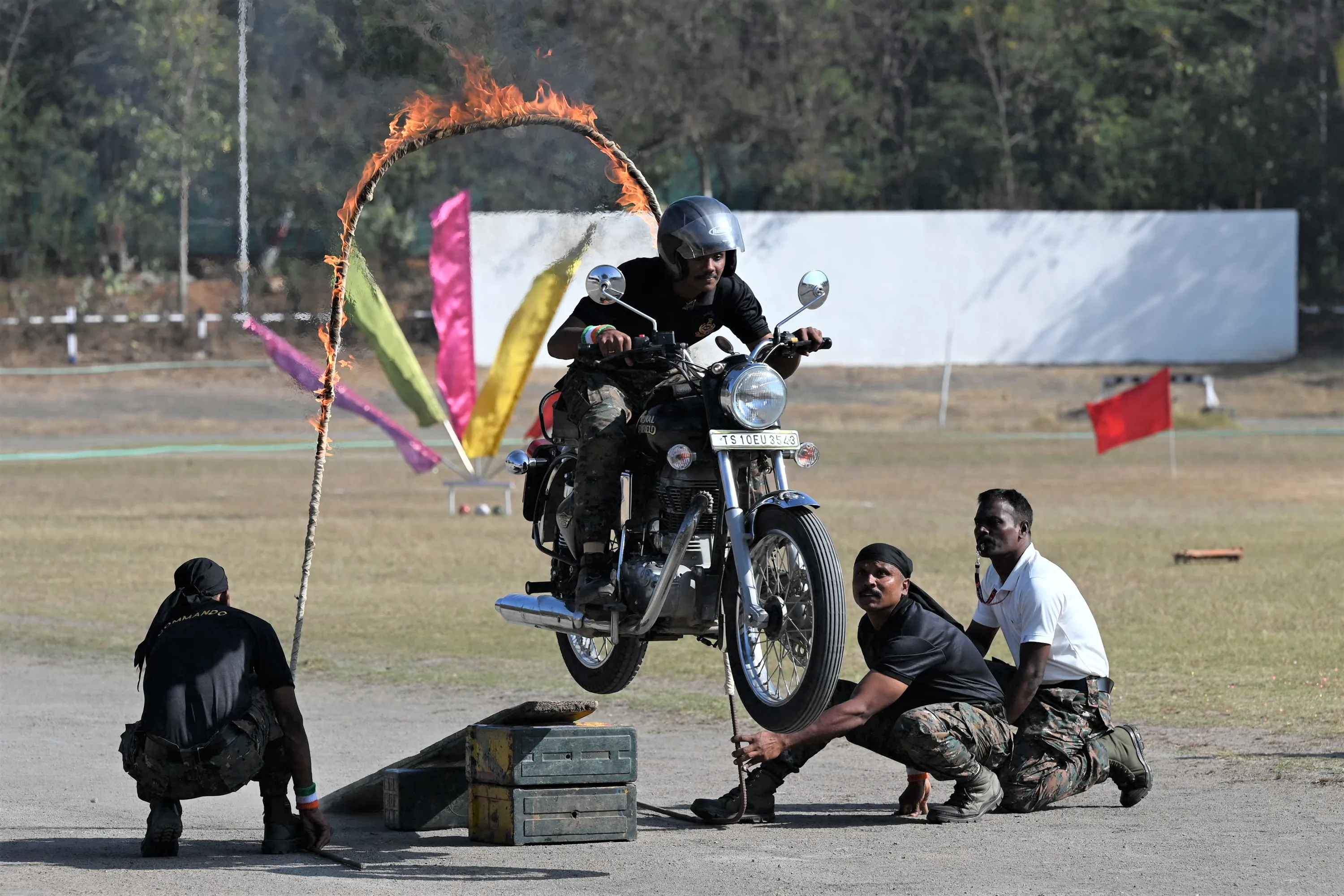 Railway Protection Force (RPF) personnel perform stunts during Republic Day celebrations at the railway sports complex ground in Secunderabad, the twin city of Hyderabad on January 26, 2023. (Photo by Noah Seelam/AFP Photo)