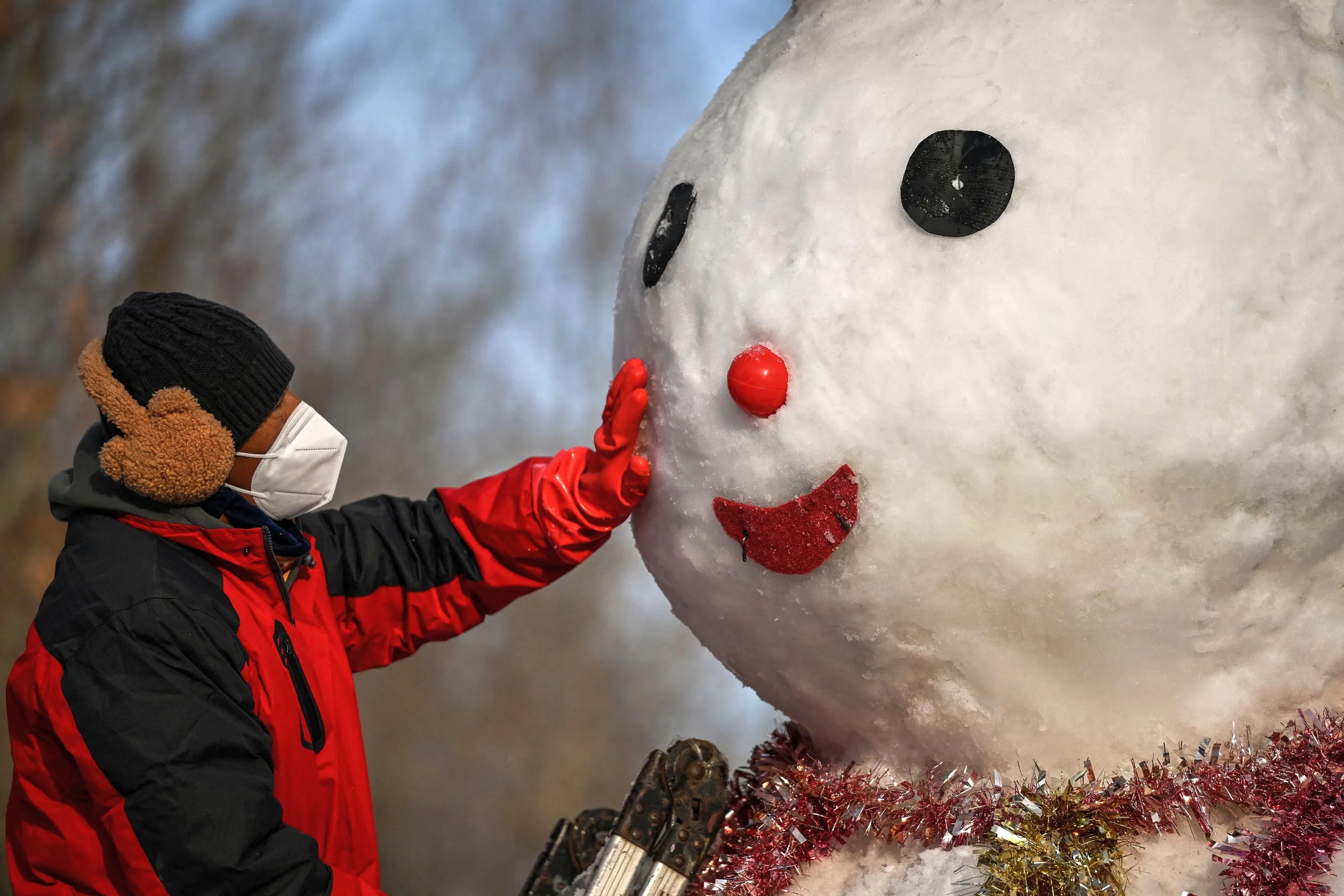 A worker builds a snowman at a park after a lighty snow fall during the night in Beijing on January 23, 2023. (Photo by Noel Celis/AFP Photo)