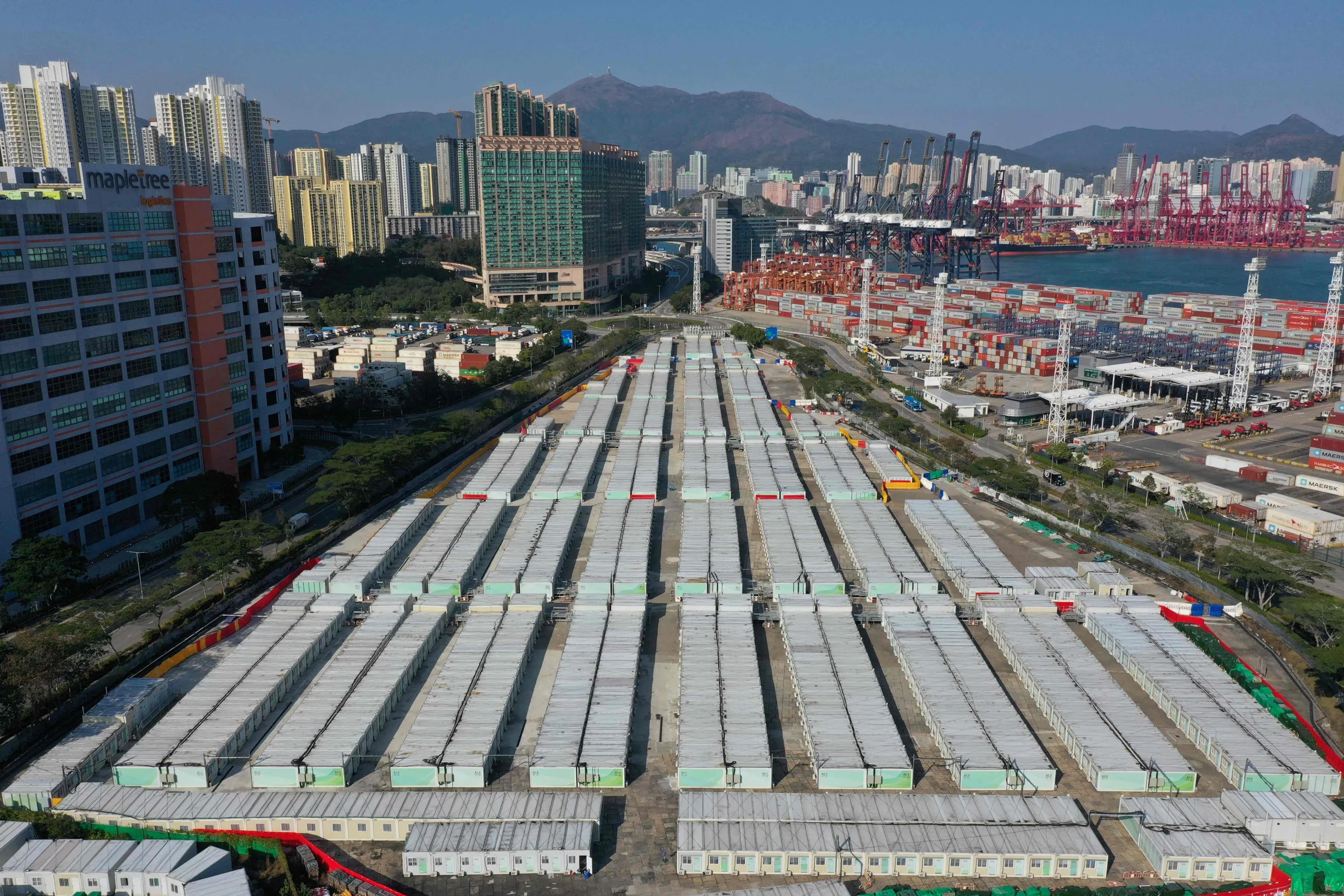 An aerial view shows Tsing Yi Covid Isolation camp in Hong Kong on January 24, 2023. Seven Hong Kong quarantine facilities including Tsing Yi, built by the government providing more than 40,000 beds are currently unoccupied. (Photo by Peter Parks/AFP Photo)