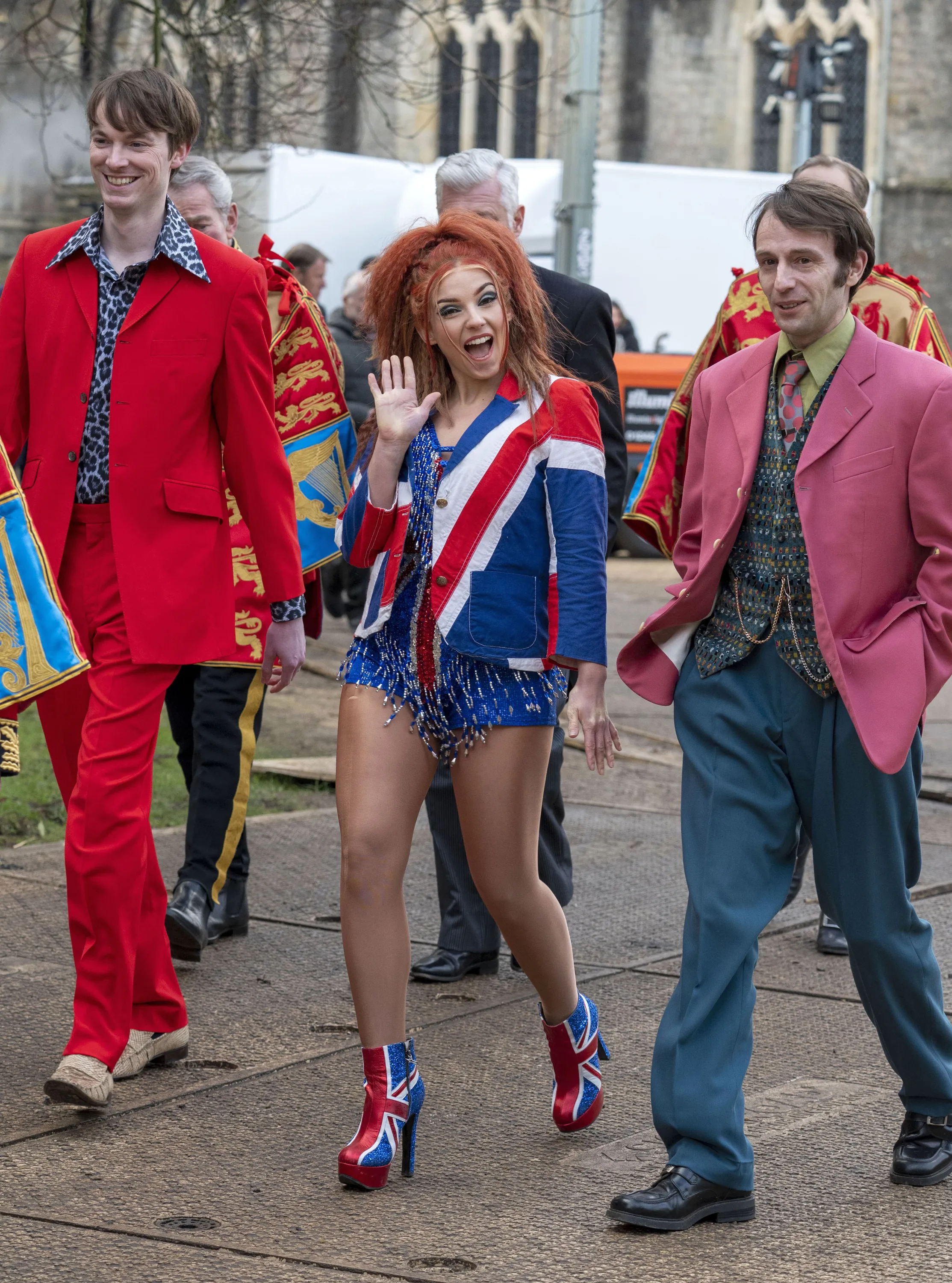 A Ginger Spice (English singer, member of the girl group the Spice Girls) lookalike arrives at Winchester Cathedral for the filming of the Netflix hit show The Crown on January 24, 2023. (Photo by Simon Jones/News Group Newspapers)
