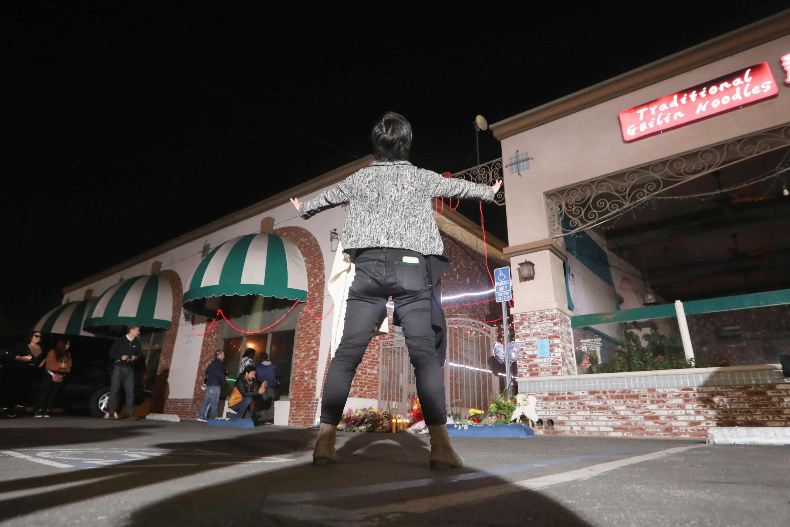 People stand outside the entrance of the Star Ballroom Dance Studio after a mass shooting during Chinese Lunar New Year celebrations in Monterey Park, California on January 23, 2023. (Photo by David Swanson/Reuters)