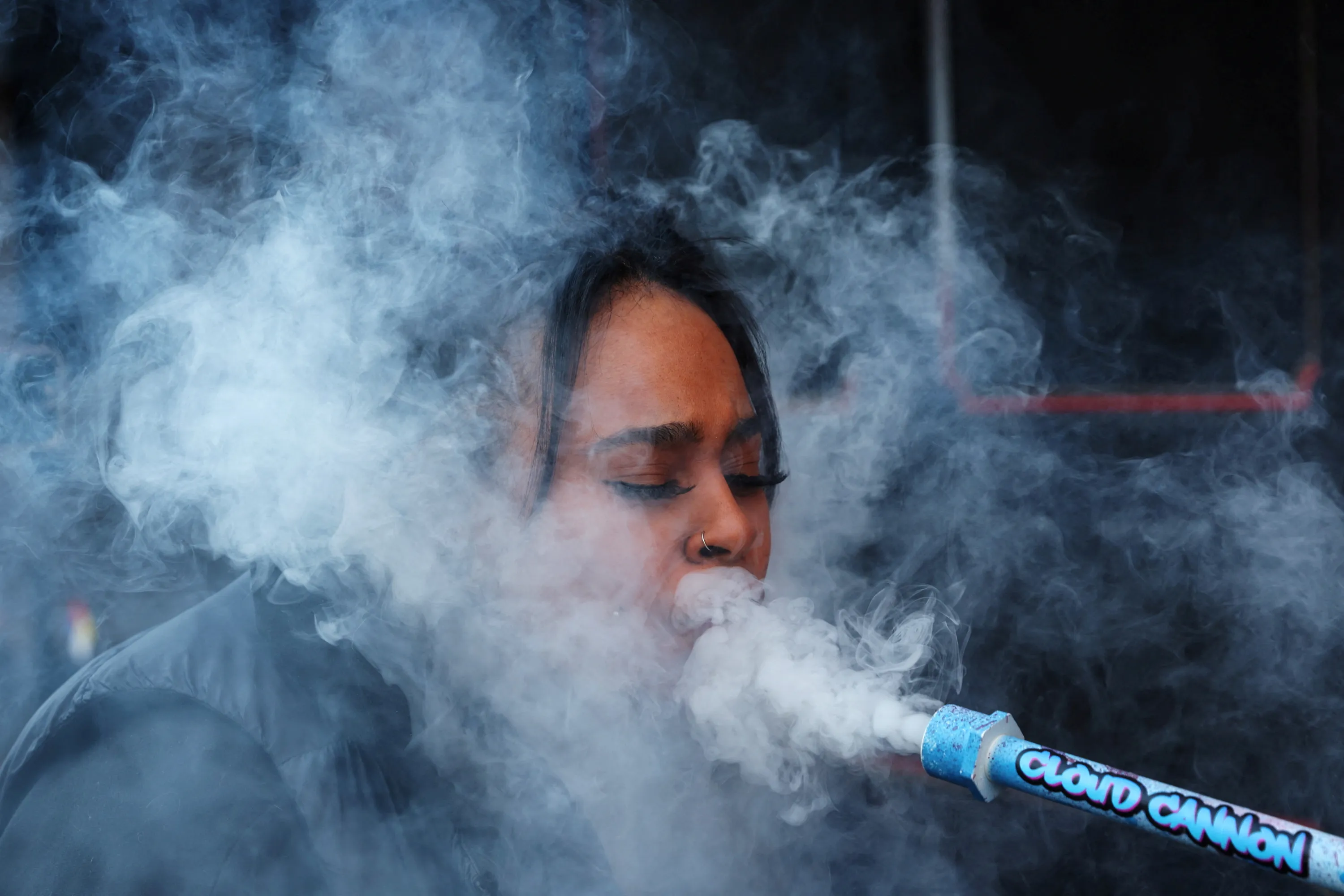 Krys Wolf, a cannabis event joint roller, smokes out of a marijuana cloud cannon on the sidewalk in the Greenwich Village section of New York City, U.S., January 24, 2023. (Photo by Shannon Stapleton/Reuters)