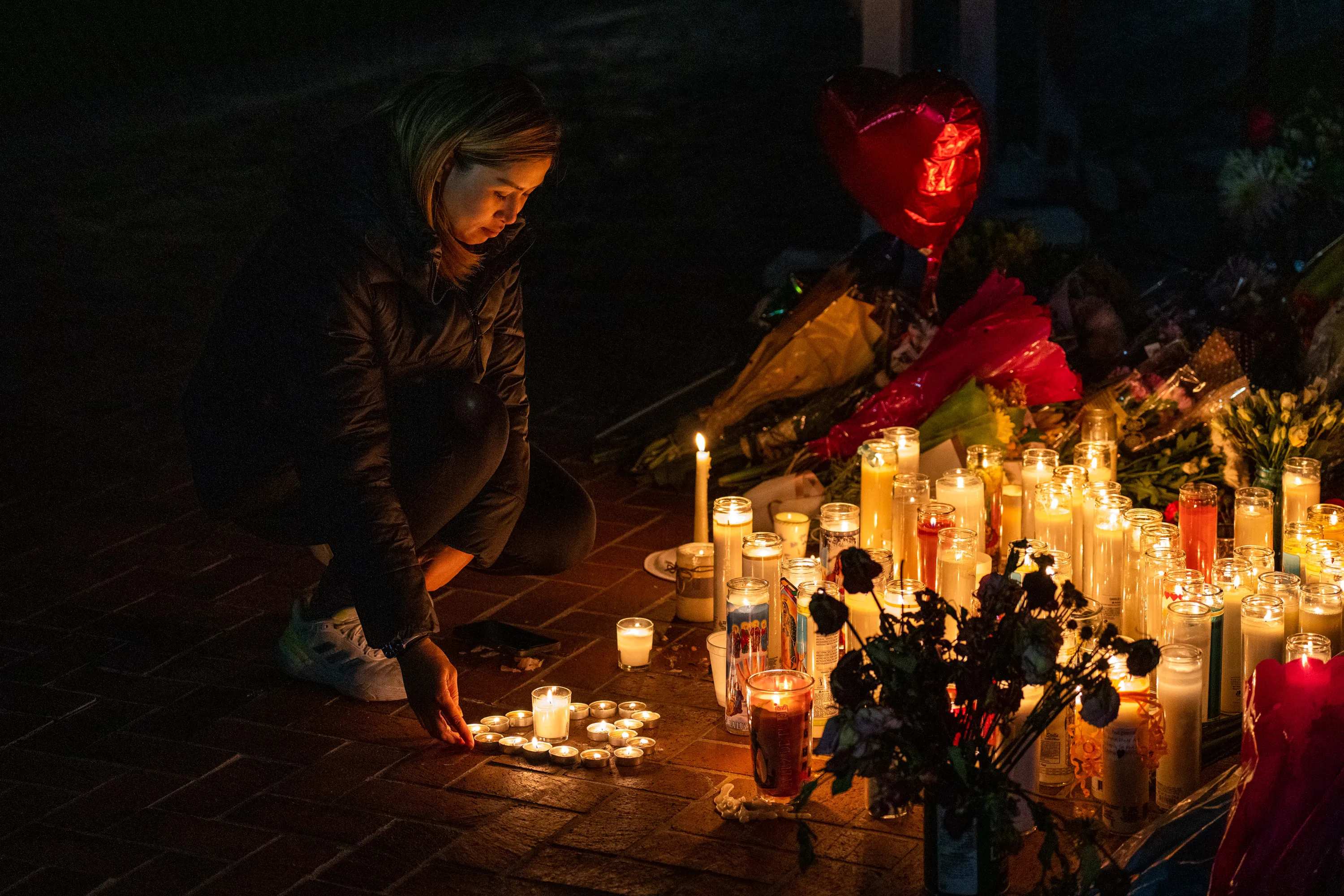 A mourner attends a candlelight vigil for victims of a mass shooting on January 23, 2023 in Monterey Park, California. At least 10 people were killed and another 10 people were injured during a mass shooting that took place at a dance studio in Monterey Park. (Photo by Qian Weizhong/VCG via Getty Images)