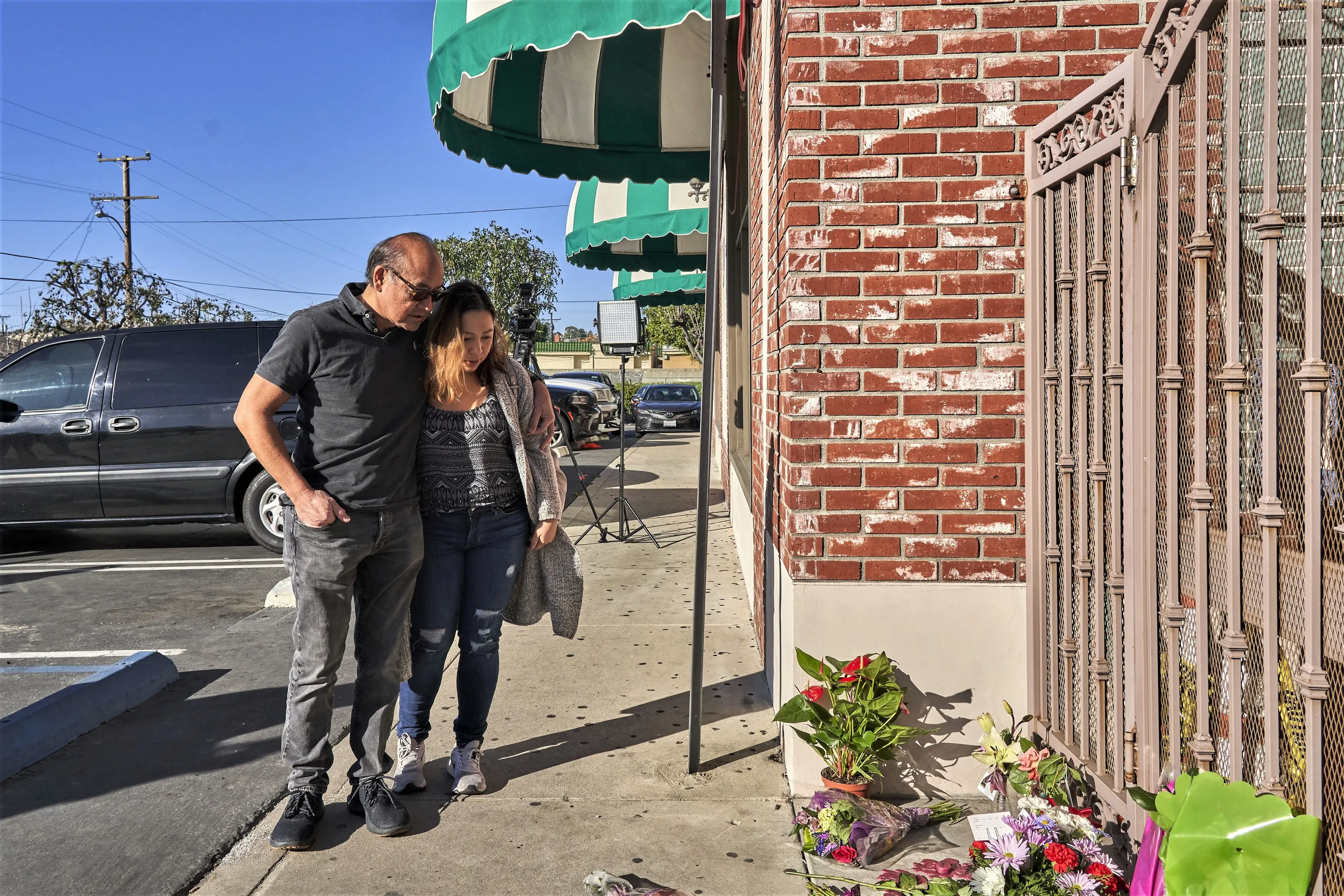 People visit a temporary memorial near the Star Dance Studio in Monterey Park, California on January 23, 2023. A gunman killed 10 people and injured another 10 at the Star Dance Studio in the evening of January 21. (Photo by Philip Cheung for The Washington Post)