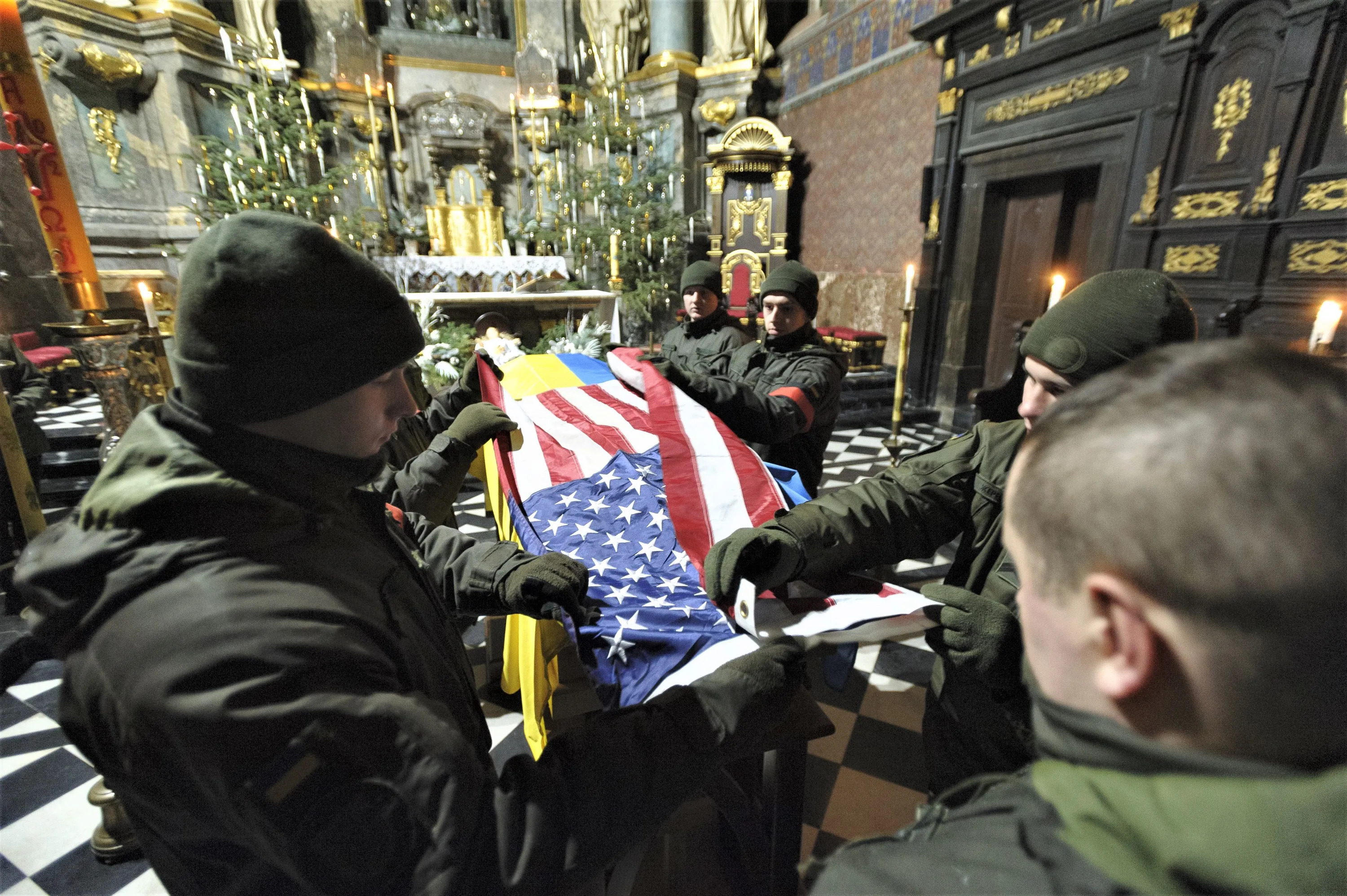 Ukrainians soldiers participate in the farewell ceremony for US citizen Daniel W. Swift in Lviv, Ukraine, Tuesday, January 31, 2023. A former US Navy SEAL who went AWOL in 2019, Swift was killed last week in Ukraine in fighting with the Russian army. (Photo by Mateusz Nowak/AP Photo)