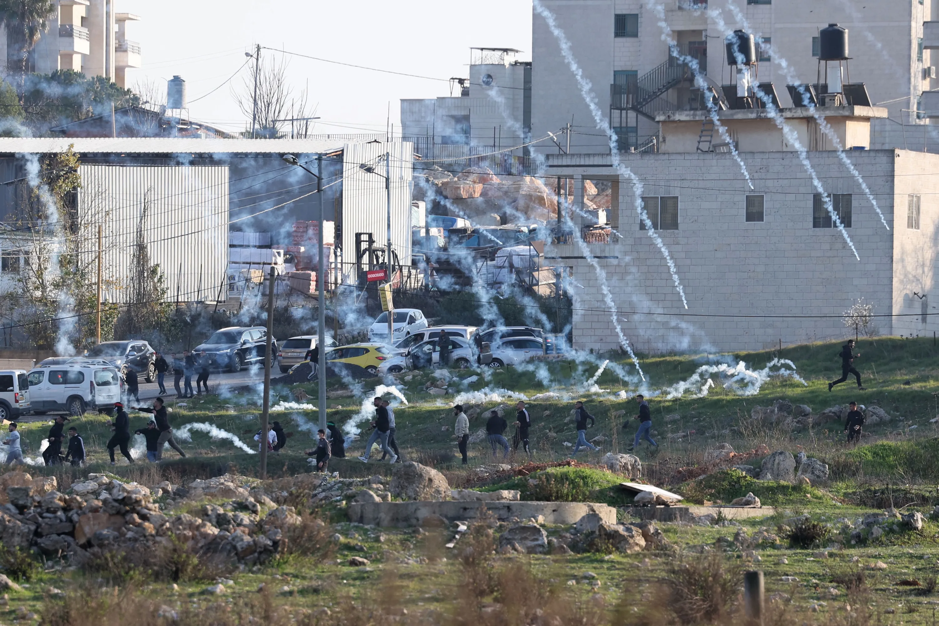 Israeli forces fire tear gas to disperse Palestinian demonstrators as they protest against the expropriation of Palestinian land on the northern entrance to the city of Ramallah, near the Jewish settlement of Beit El, in the occupied West Bank on January 26, 2023. (Photo by Ahmad Gharabli/AFP Photo)