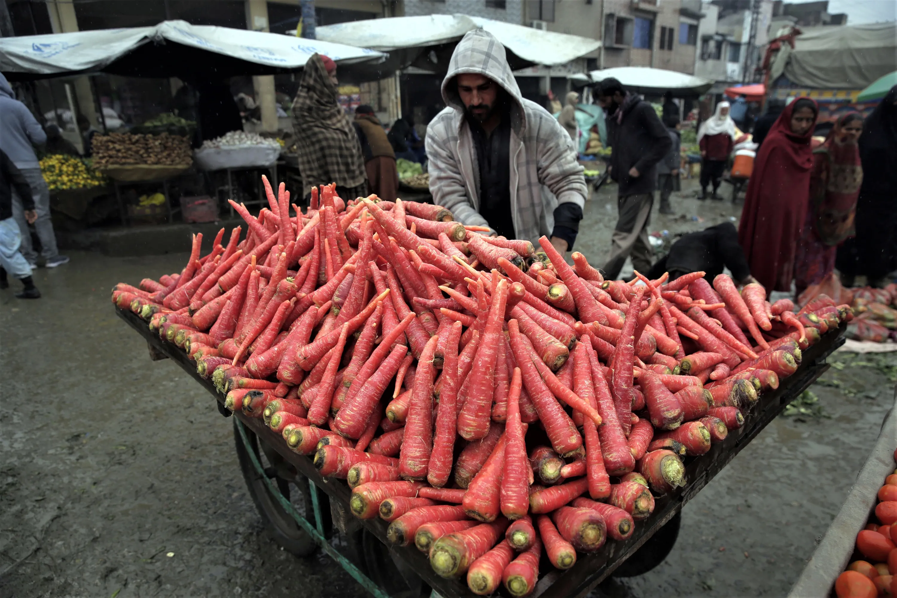A produce vendor arranges carrots as he waits for customers at a market in Islamabad, Pakistan, on January 22, 2022. Growing numbers of people in Asia lack enough food to eat as food insecurity rises with higher prices and worsening poverty, according to a report by the Food and Agricultural Organization and other UN agencies released Tuesday, Jan. 24, 2023. (Photo by Rahmat Gul/AP Photo)