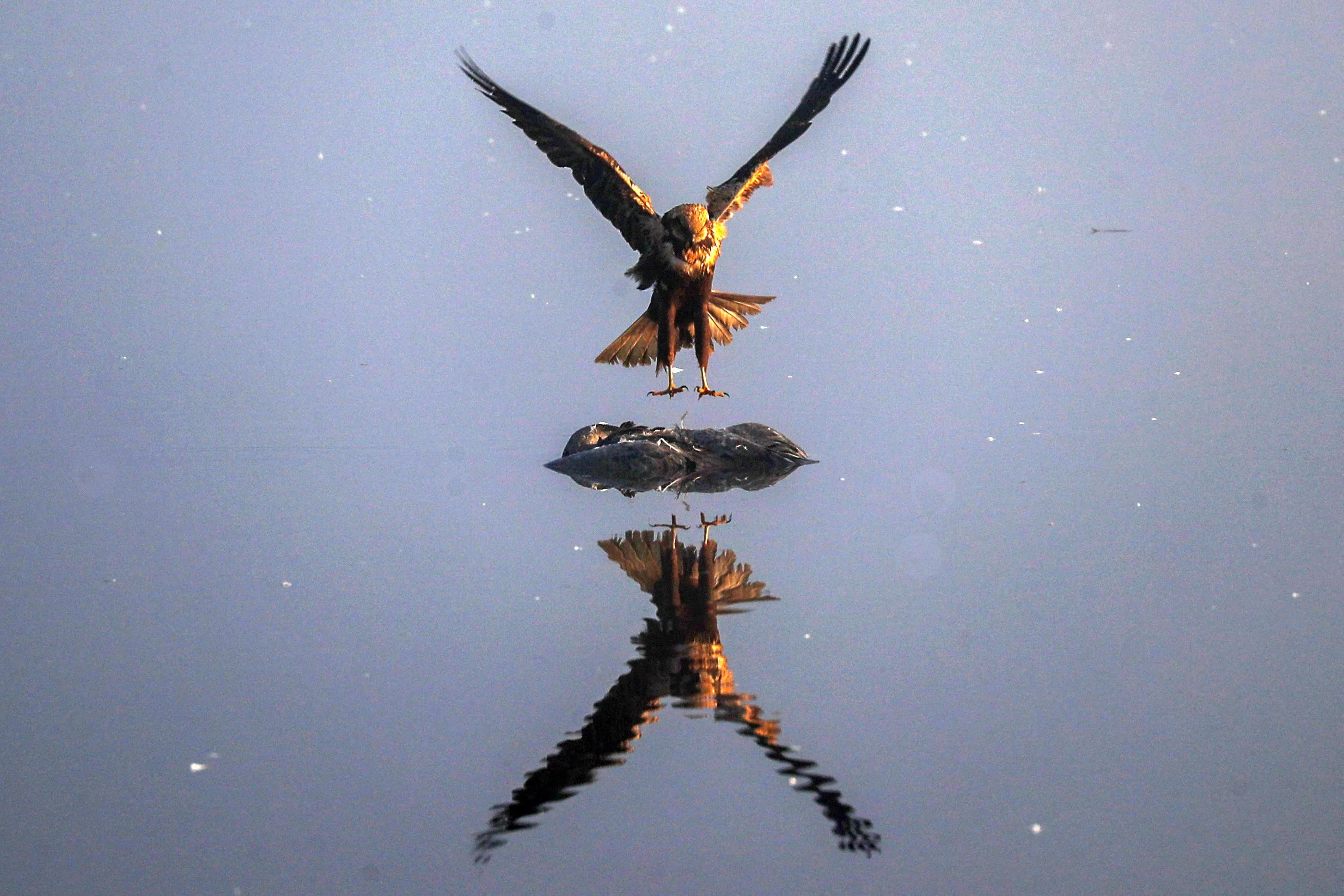 A hawk lands over a dead Gray Crane at the Agamon Hula Conservation Lake in the north of Israel, 26 January 2023. As a major stopover for migrating birds along the Syrian-African Rift, hundreds of thousands of birds pass yearly at the Agamon making their way to Africa and then back to Europe, with some spending the winter at the Lake. (Photo by Atef And Safadi/EPA/EFE)