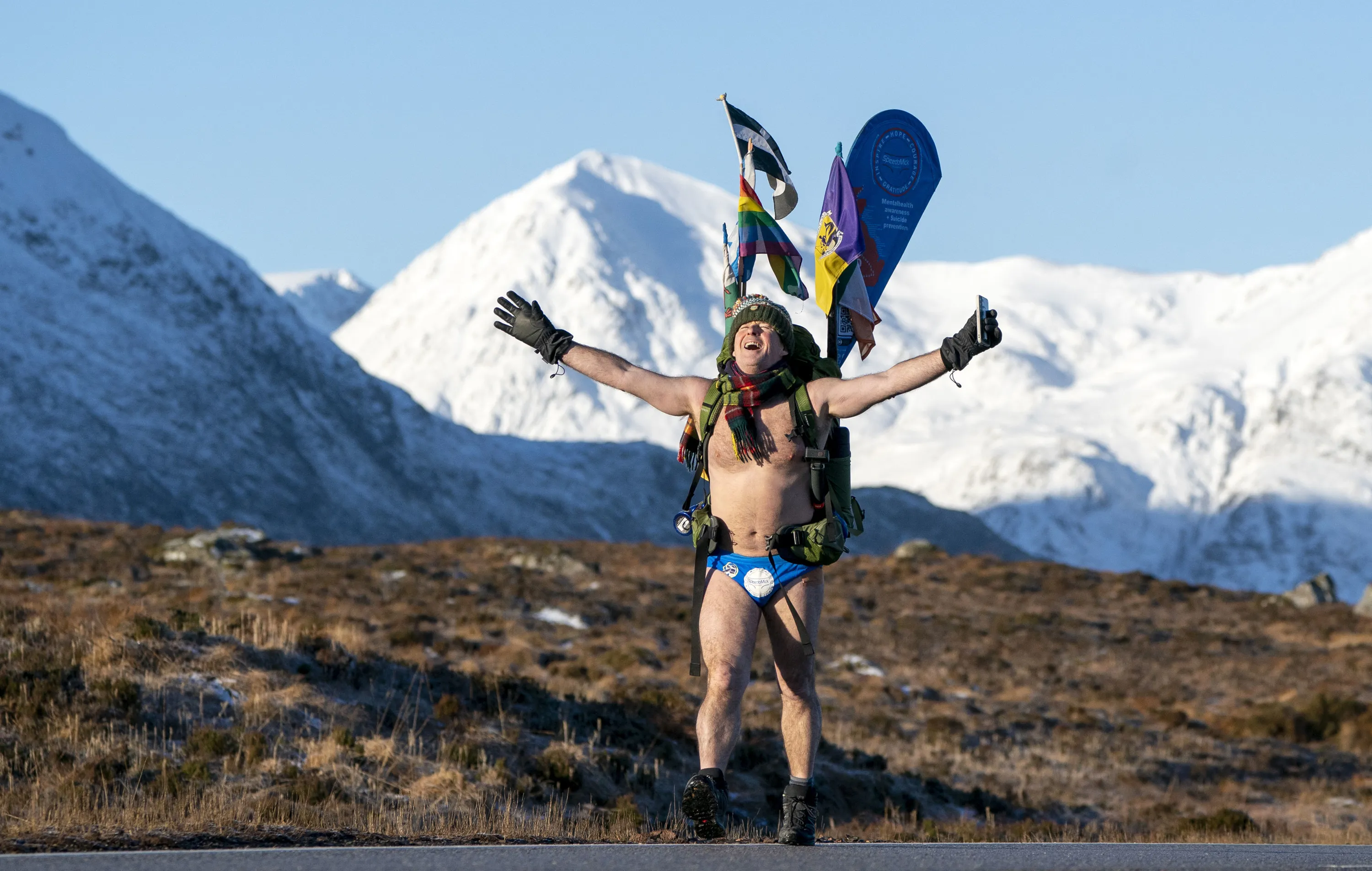 Mick Cullen, otherwise known as Speedo Mick, walks through Glencoe, Scotland in sub-zero temperatures wearing only his swimming trunks on Friday, January 20, 2023. Mick is walking 1,000 miles from John O'Groats to Land's End whilst also completing the Three-Peak Challenge to scale Ben Nevis, Scafell Pike and Mount Snowdon along the way. (Photo by Jane Barlow/PA Wire Press Association)
