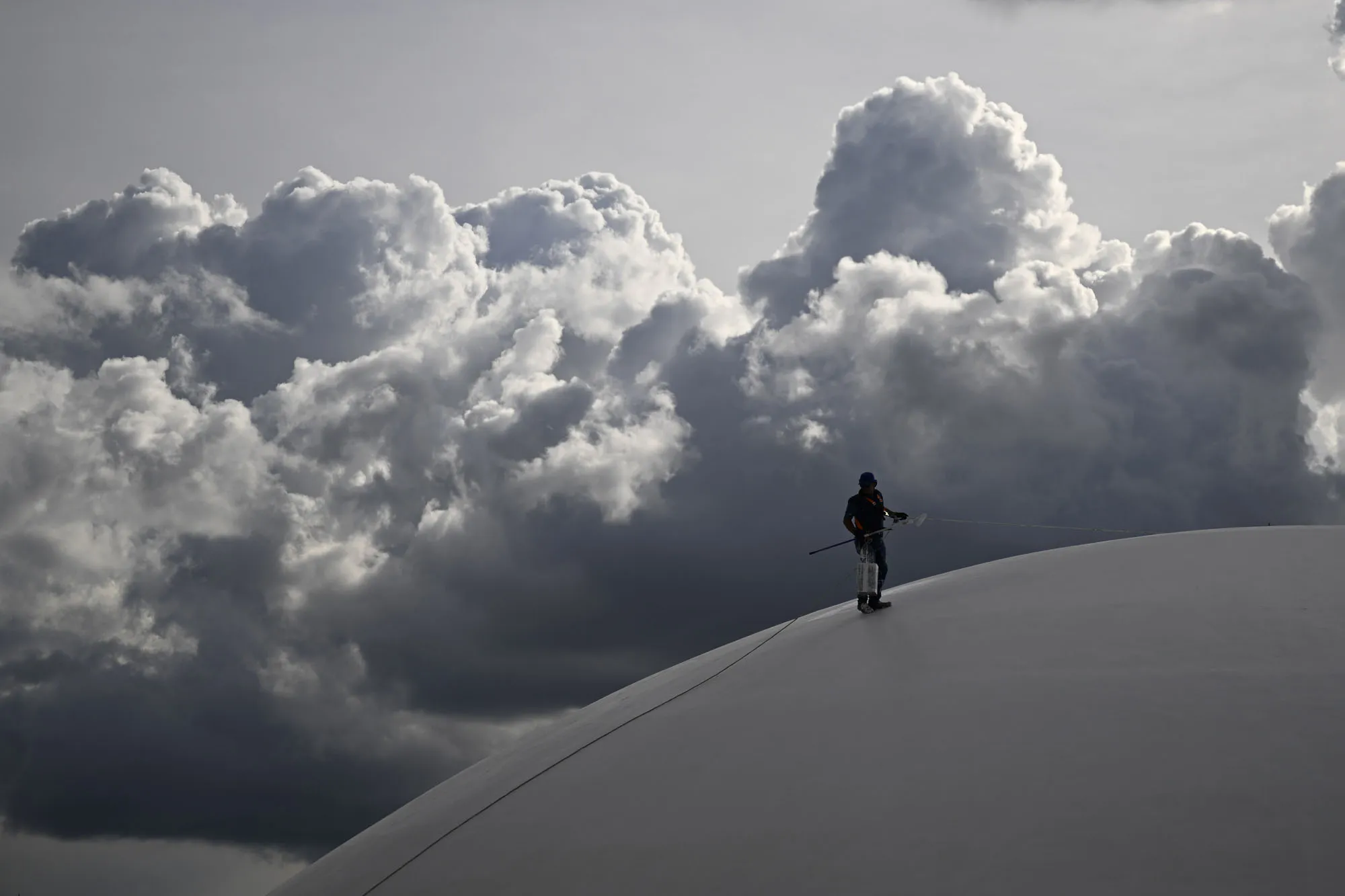 Workers are seen on the afternoon of Monday, January 16th, painting the dome of the Federal Senate in Brasilia, Brazil. After an anti-democratic demonstration held by supporters of former President of Brazil Jair Bolsonaro on January 8. (Photo by Mateus Bonomi/Anadolu Agency via Getty Images)