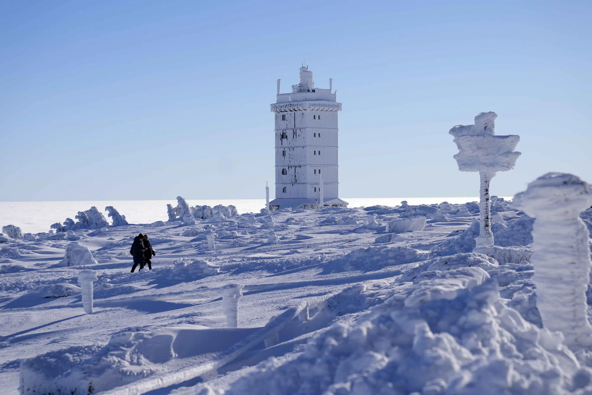 People pass the former weather station at the 1,142-meter high (3,743 feet) snow covered Brocken at the Harz mountains near Schierke, Germany, Tuesday, January 24, 2023. (Photo by Matthias Schrader/AP Photo)