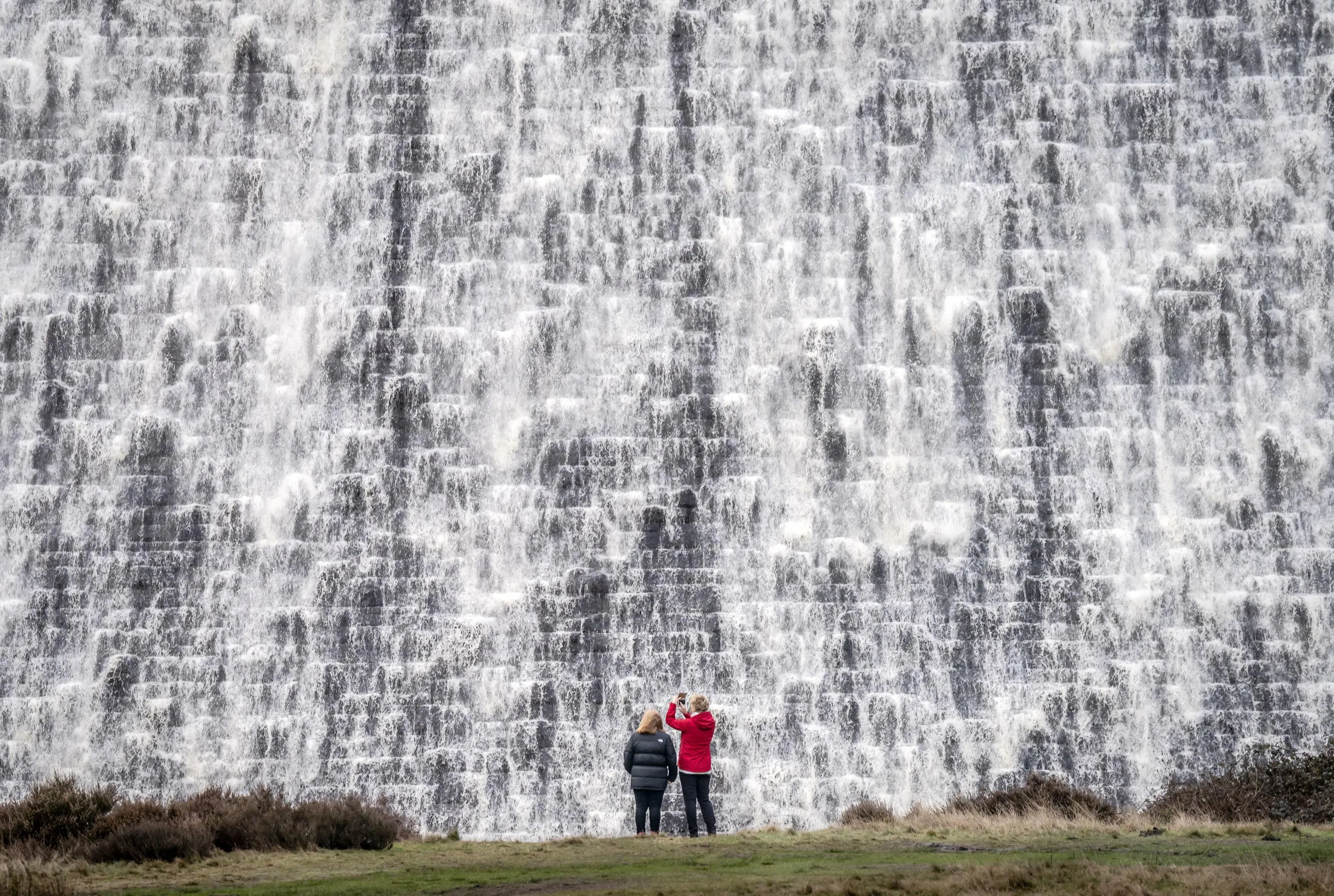 People look on as water pours down the front of Derwent Dam in Derbyshire on Monday, January 9, 2023, ahead of a Met Office yellow weather warning for rain, for parts of the UK on Tuesday. (Photo by Danny Lawson/PA Images via Getty Images)