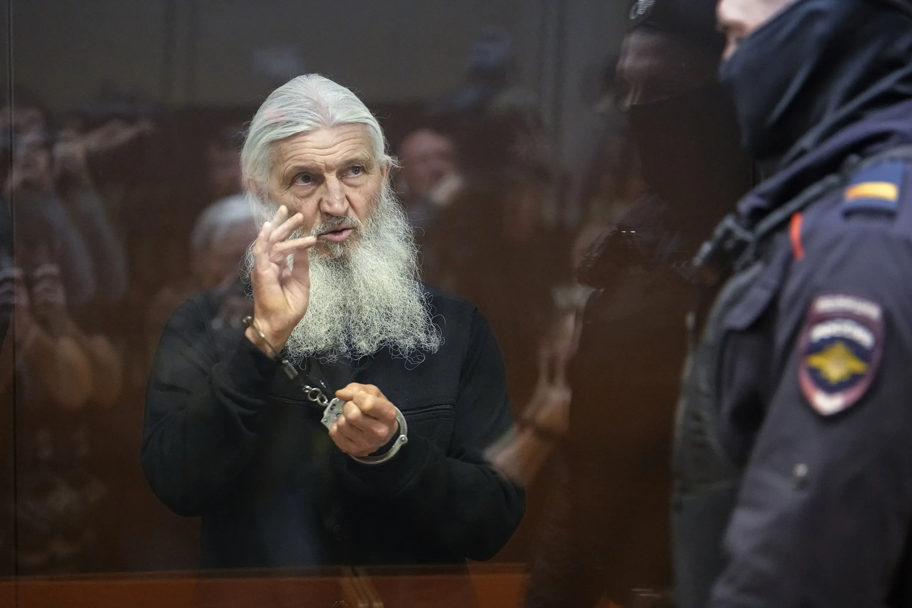 Nikolai Romanov, a former monk known as Father Sergiy until he was excommunicated by the Russian Orthodox Church, baptizes those present in the hall from behind a glass cage during his trial in Moscow, Russia, Friday, January 27, 2023. The monk, who denied that the coronavirus existed and challenged the Kremlin, was handed a new prison sentence Friday on charges of inciting hatred. (Photo by Alexander Zemlianichenko/AP Photo)