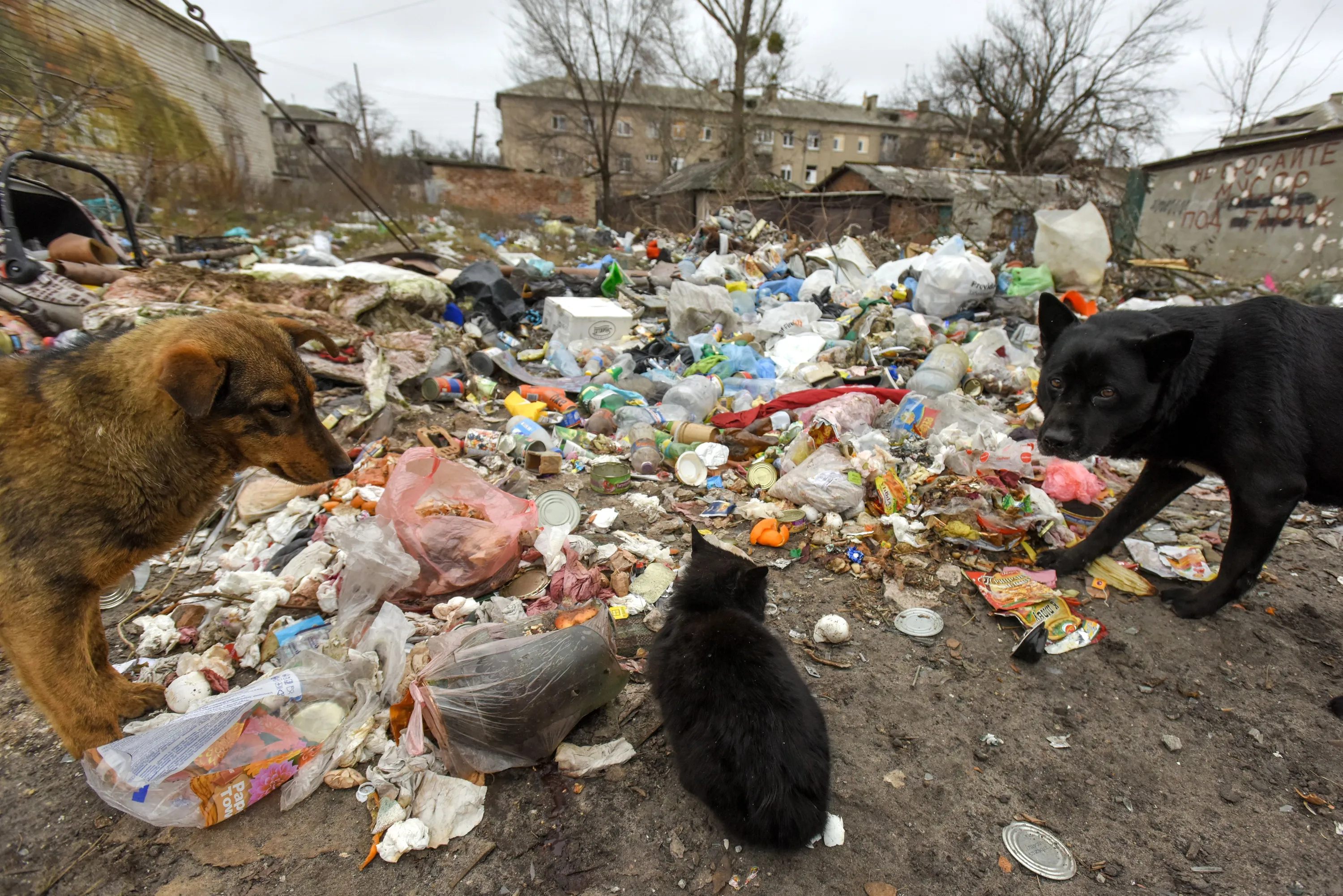 Homeless animals look for food in the garbage in the town of Lyman, Donetsk region, Ukraine, 22 January 2023. Lyman was re-captured by Ukraine's armed forces in October. Before the beginning of active combat action population of Lyman was around 41,000. After being under Russian occupation, without electricity, water and gas supply, infrastructure is slowly renewing. Russian troops entered Ukraine terriroty on 24 February 2022, starting an armed conflict that has provoked destruction and a humanitarian crisis. (Photo by Oleg Petrasyuk/EPA/EFE)