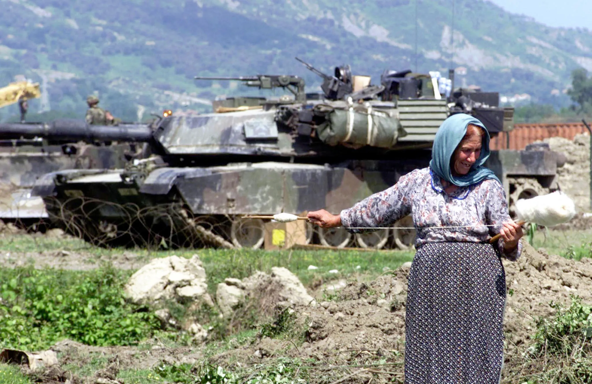 An Albanian woman spins wool in front of a US M1 Abrams tank, outside Tirana airbase Rinas, Wednesday, May 12, 1999. Rinas airbase plays crucial role in NATO's humanitarian mission “Shining Hope” as well as a base for possible military action. (Photo by Darko Bandic/AFP Photo)