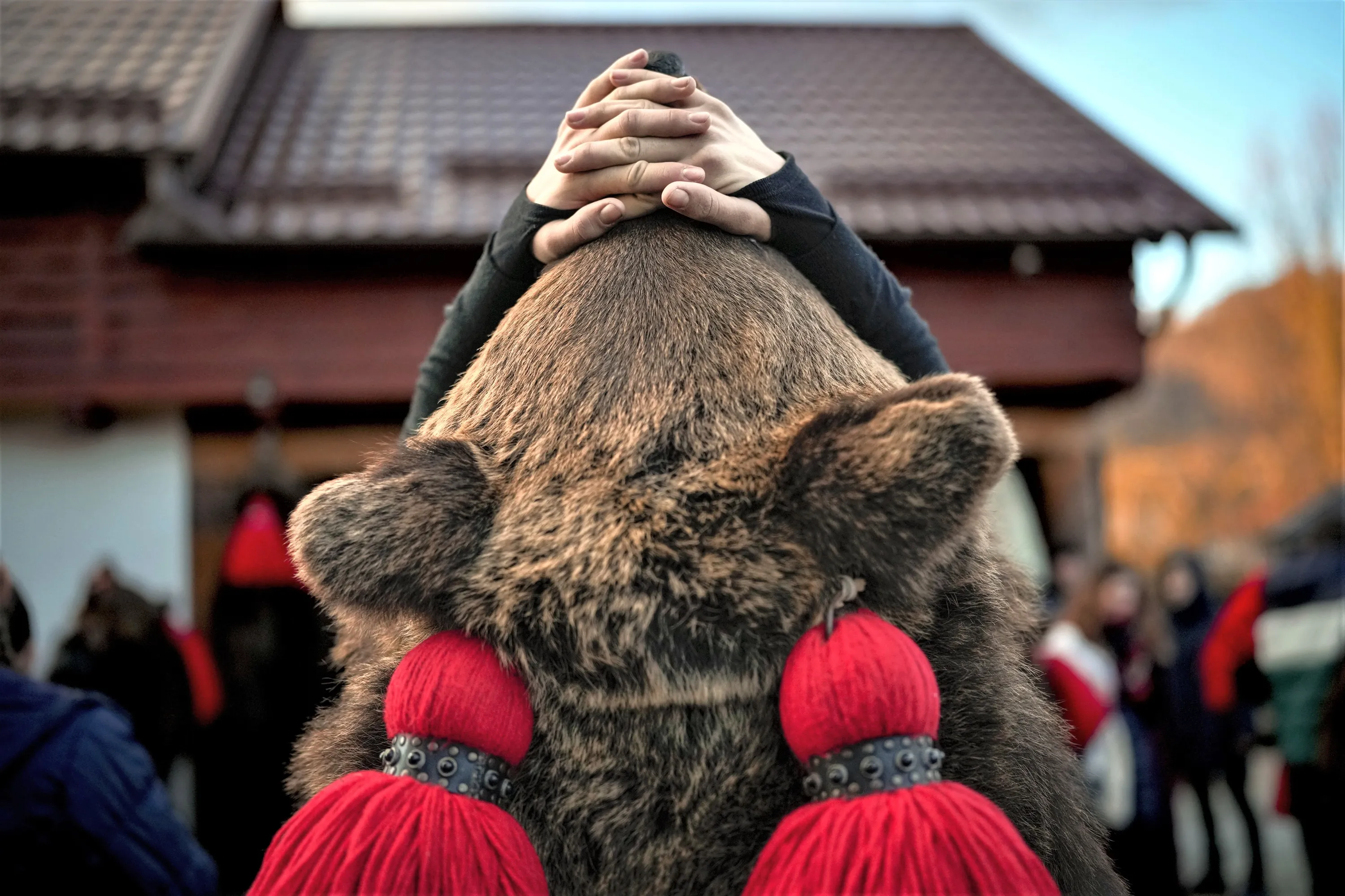 A boy wearing a bear fur costume waits for the start of a parade showcasing regional winter traditions in Comanesti, northeastern Romania, Friday, December 30, 2022. Every year on Dec. 30 bear hundreds of people dressed as bears, from toddlers to adults, fill the main street growling as they dance or jokingly simulating aggressive moves towards the many onlookers. (Photo by Andreea Alexandru/AP Photo)
