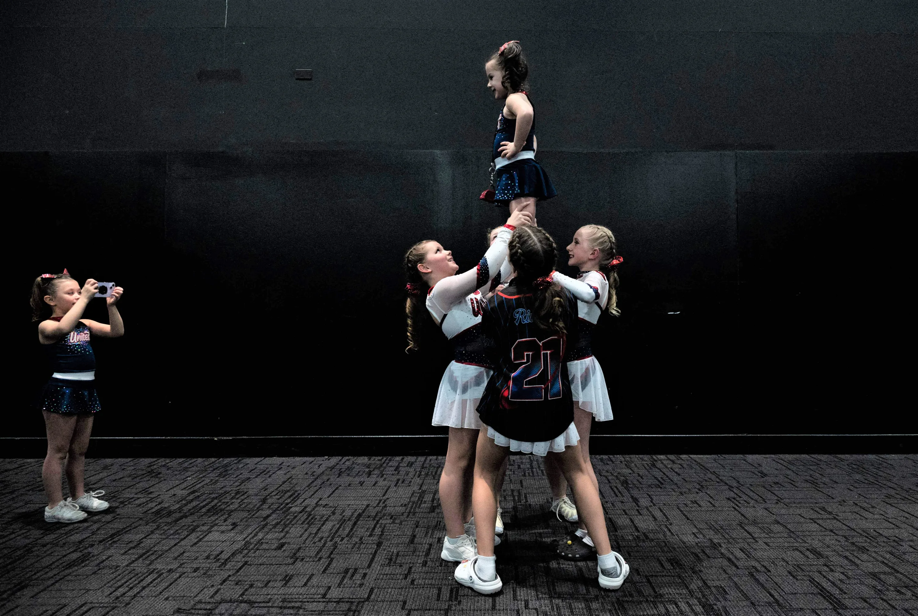 A young team member takes a photo of her teammates practicing during the Frost Extreme cheerleading event at the Chase Center in Wilmington, Delaware, on January 29, 2023. The event brings together recreational, high school, dance, and competitive teams to compete. (Photo by Andrew Caballero-Reynolds/AFP Photo)