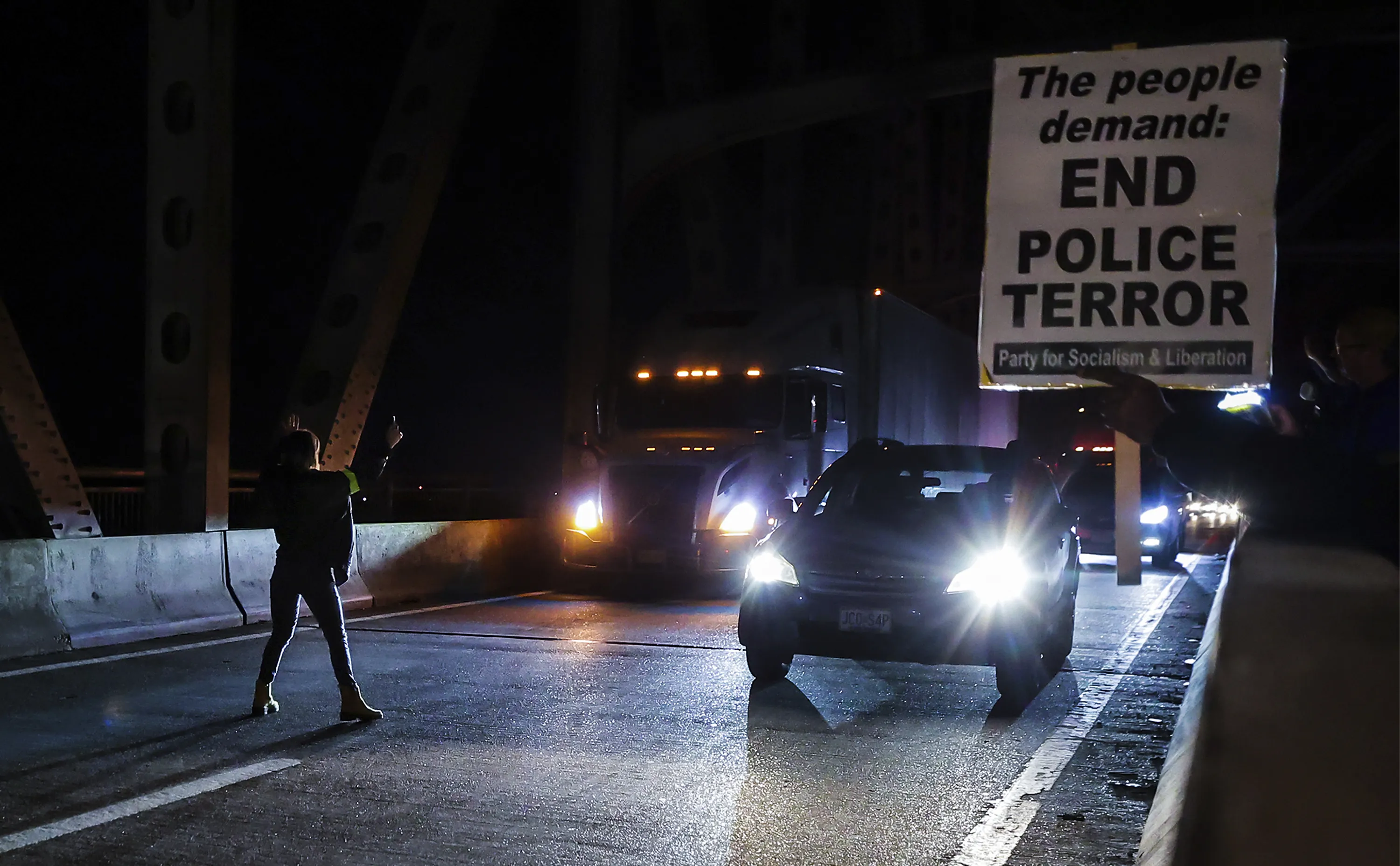 A demonstrator tries to stop traffic along the Interstate 95 bridge during a protest over the death of Tyre Nichols, Friday, January 27, 2023, in Memphis, Tenn. Authorities released video footage Friday showing Nichols being beaten earlier this month by five Memphis police officers who held the Black motorist down and repeatedly struck him with their fists, boots and batons as he screamed for his mother. (Photo by Patrick Lantrip/Daily Memphian via AP Photo)