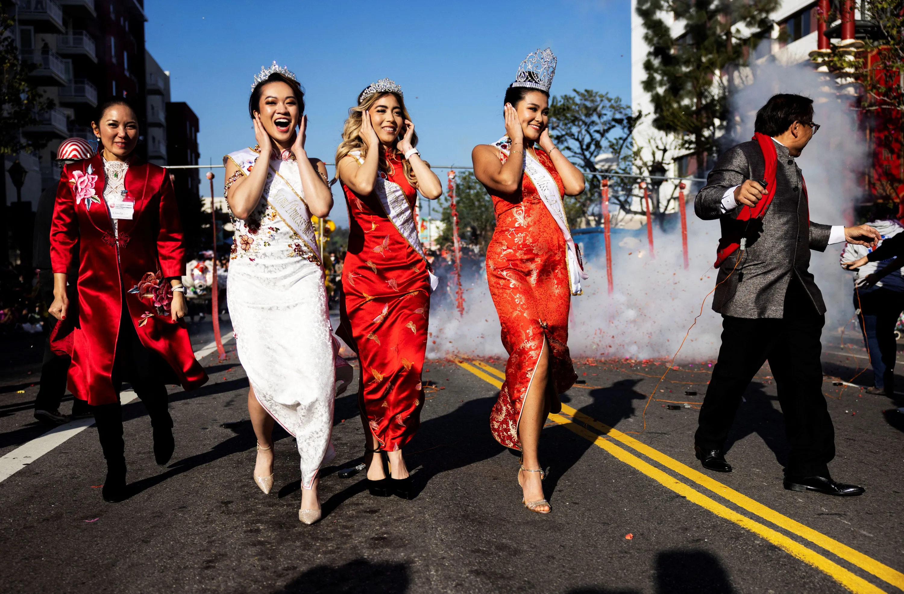 Participants run after lighting firecrackers during the 124th annual Golden Dragon Lunar New Year Parade in Los Angeles, California, U.S., January 28, 2023. (Photo by Aude Guerrucci/Reuters)