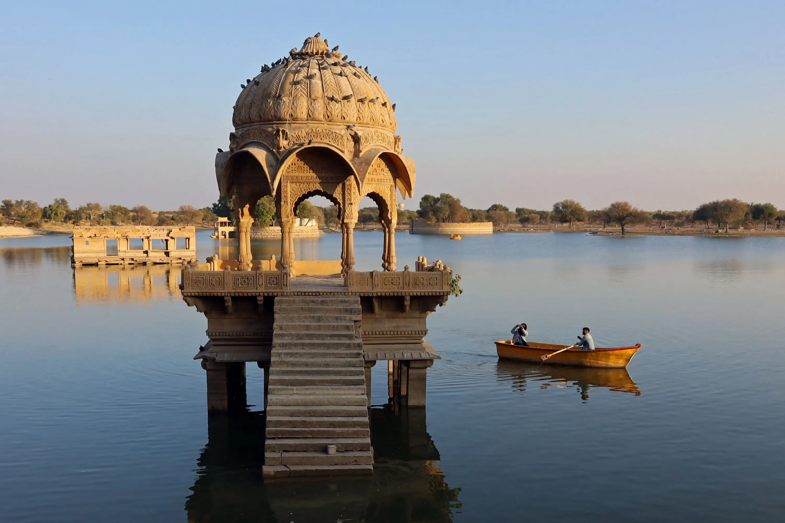 In this photograph taken on January 24, 2023, visitors view a building in Gadisar Lake in Jaisalmer in India's desert state of Rajasthan. (Photo by Sebastien Berger/AFP Photo)