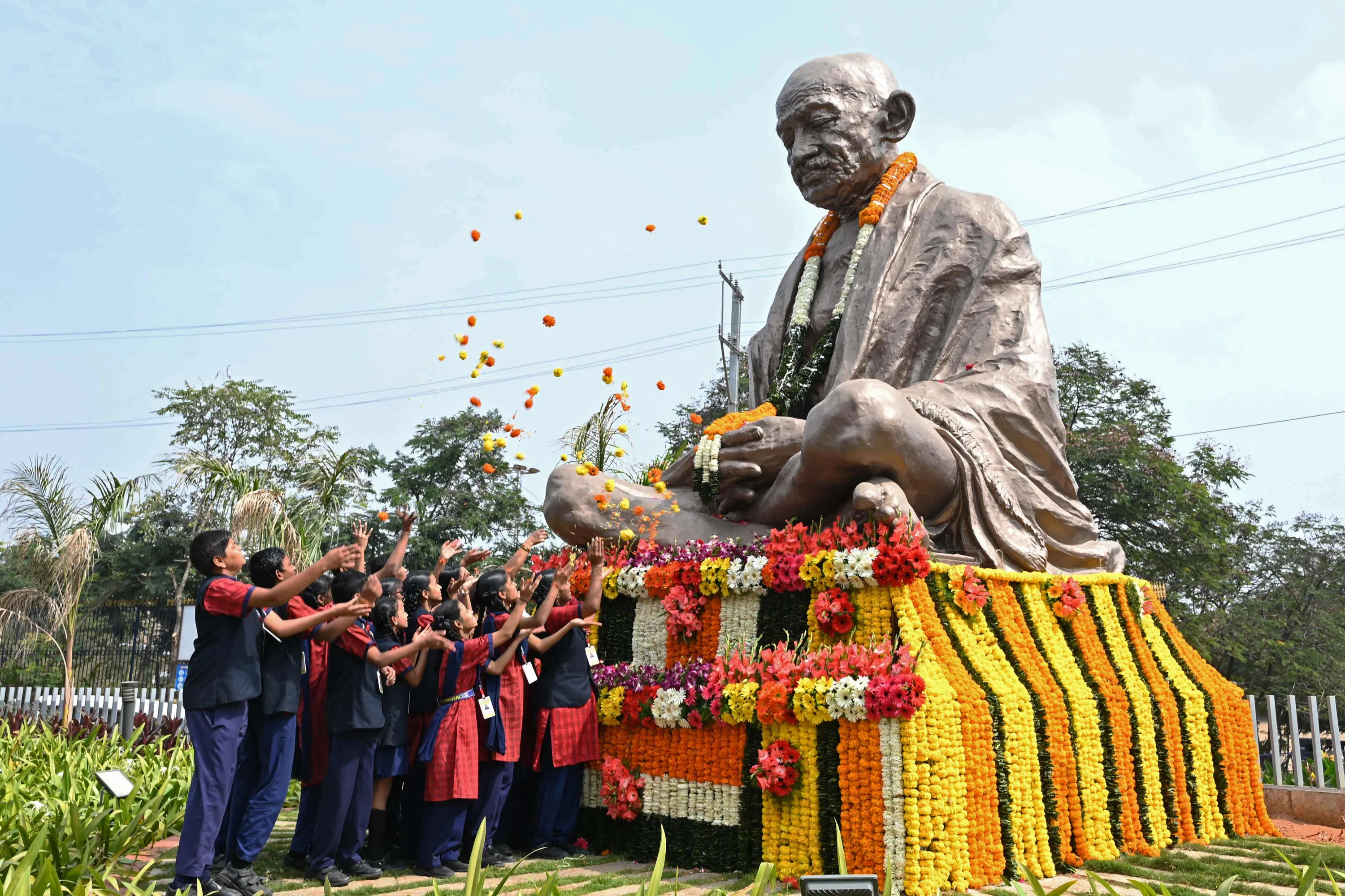 School students scatter flowers on the statue of Mahatma Gandhi on his death anniversary in Hyderabad on January 30, 2023. The death anniversary of Gandhi, who is widely known in India as Bapu (father), is also observed as Martyr's Day in the country. (Photo by Noah Seelam/AFP Photo)