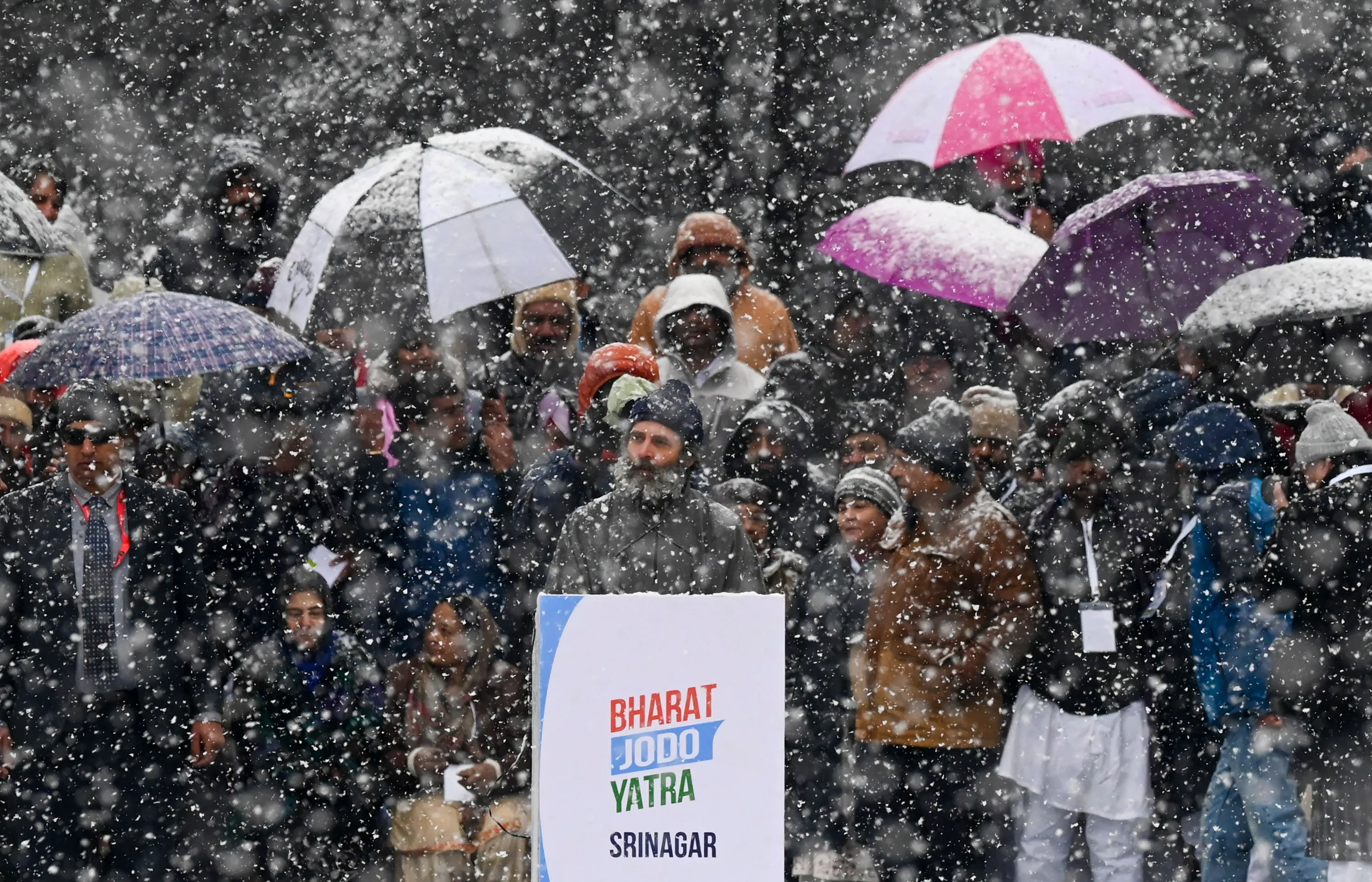 India's Congress party leader Rahul Gandhi speaks at a public meeting amid heavy snowfall as he concludes the 'Bharat Jodo Yatra' march in Srinagar on January 30, 2023. (Photo by Tauseef Mustafa/AFP Photo)