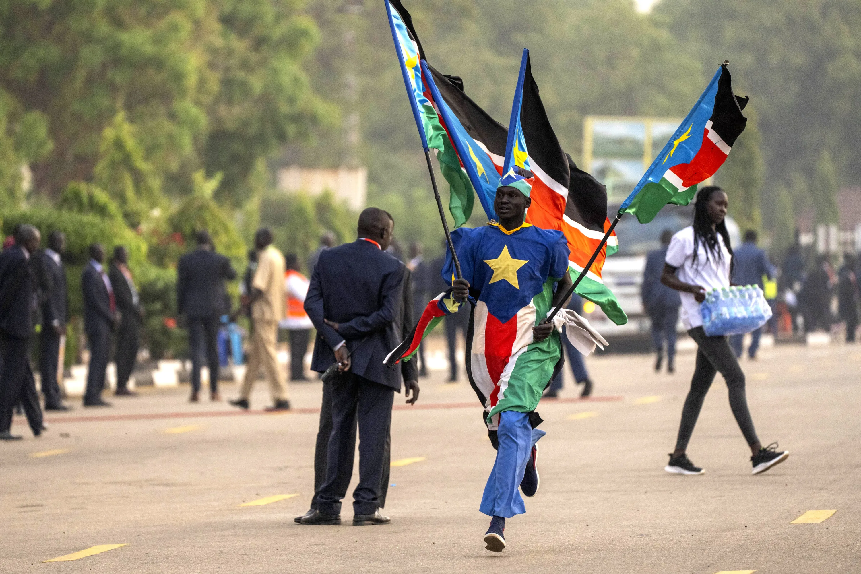 A man runs with flags next to the audience as they await the arrival of Pope Francis for a Holy Mass at the John Garang Mausoleum in Juba, South Sudan Sunday, Febriary 5, 2023. (Photo by Ben Curtis/AP Photo)