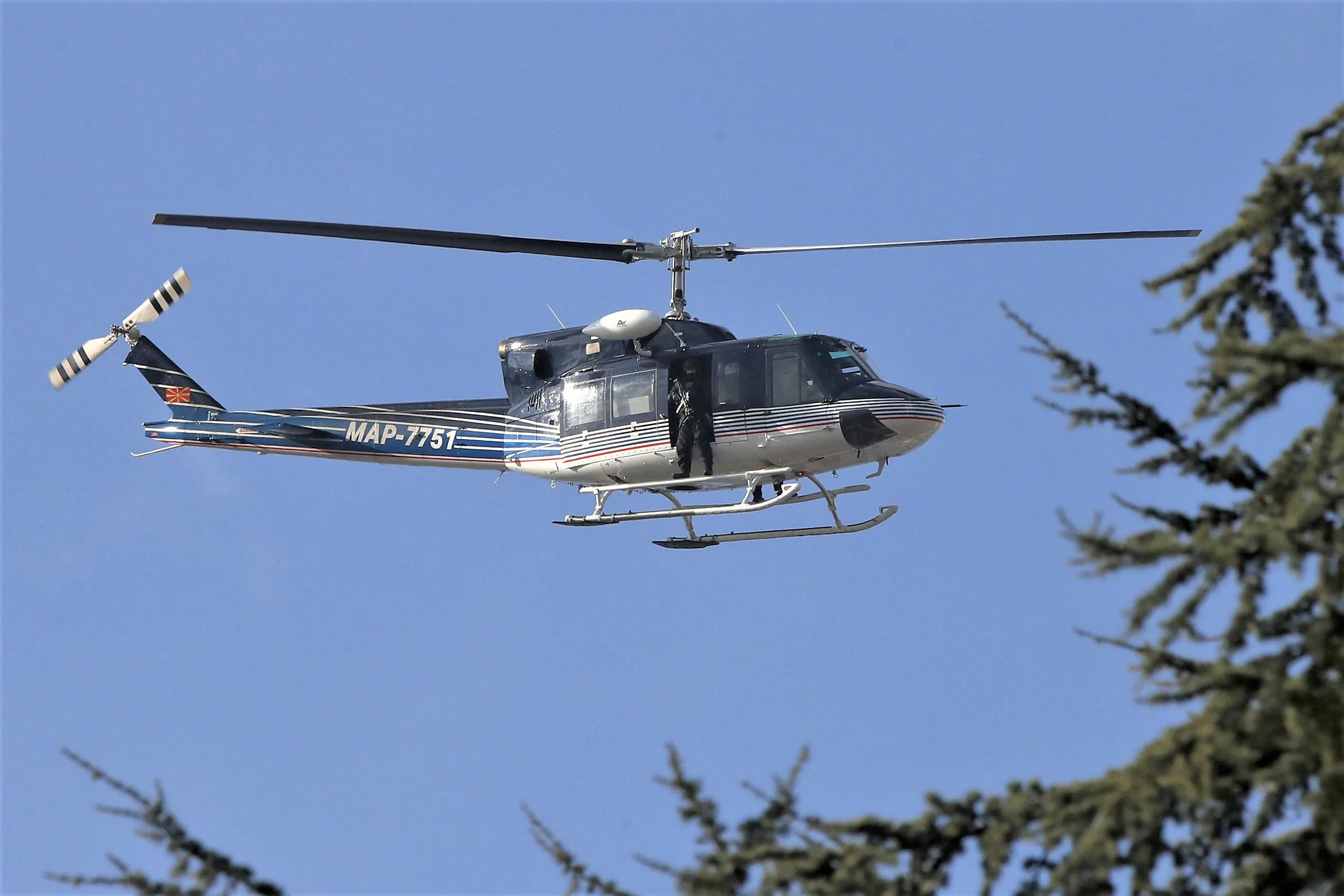 Armed police officers in a helicopter control the area at the grave of Goce Delcev, a revolutionary who opposed Ottoman rule in the Balkans that ended after hundreds of years in the early 20th century, at the church of the Ascension of Jesus, in Skopje, North Macedonia, on Saturday, February 4, 2023. North Macedonia is honoring Saturday the birth of 19th century revolutionary hero Goce Delcev with tight security in capital Skopje amid fears of potential clashes between opposing nationalist groups from North Macedonia and Bulgaria, as both neighboring countries have claims of the historic figure. (Photo by Boris Grdanoski/AP Photo)