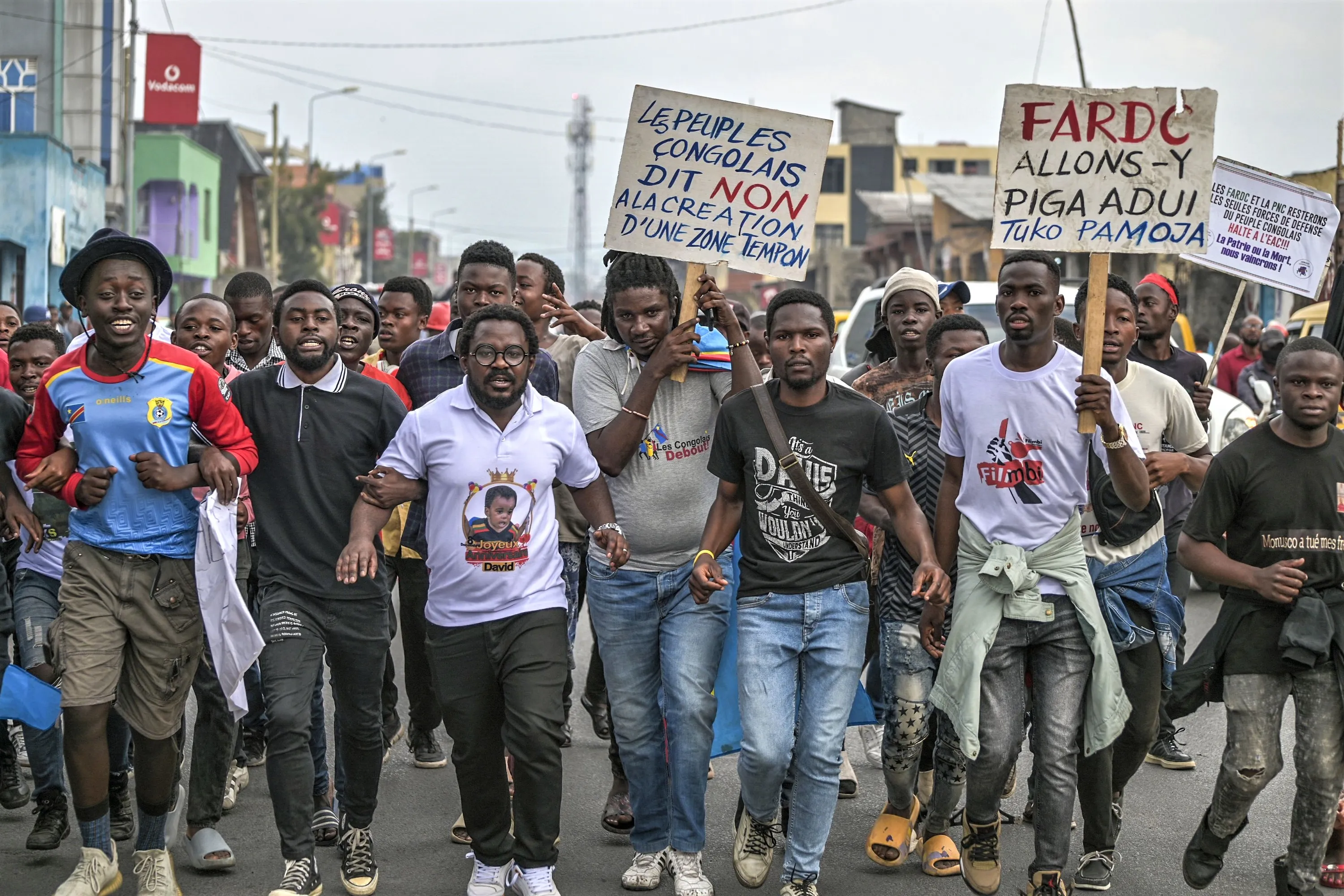 Residents of Goma, Democratic Republic of the Congo, demonstrate Wednesday January 18, 2023 against the scheduled arrival of South Sudanese troops set to join Kenyan forces deployed to assist the Congolese army in its fight against M23 rebels. Demonstrators clashed with police who said the protest was not authorised. (Photo by Moses Sawasawa/AP Photo)