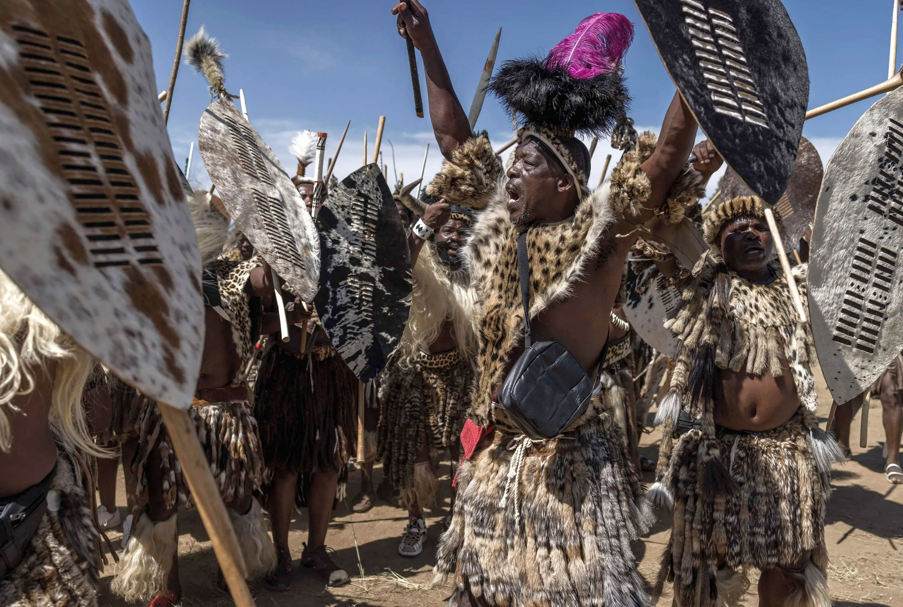 Members of the Amabutho Zulu regiments parade before the reenactment of the Battle of Isandlwana, in Isandlwana on January 21, 2023. (Photo by Marco Longari/AFP Photo)
