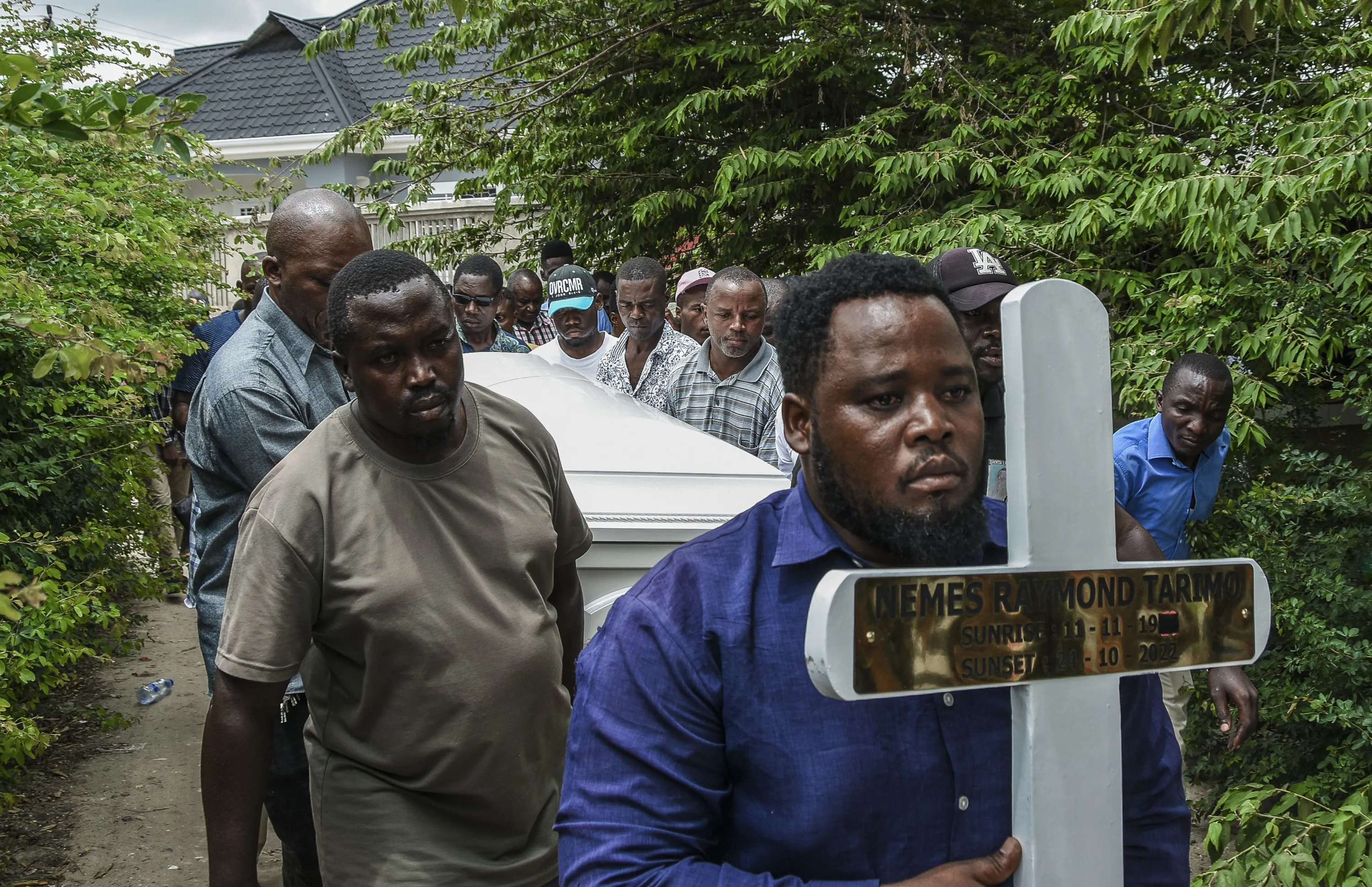 Mourners proceed bearing a cross and a coffin with the body of Tanzanian student, Nemes Tarimo, whose body arrived at his homeplace in Dar es Salaam, Tanzania, on January 27, 2023, after he was killed fighting for Russia in Ukraine after being recruited in jail. Nemes Tarimo was serving a seven-year term for an undisclosed offence when Russia's Wagner mercenary group recruited him for payment and the promise he would be freed after the war, Tanzanian authorities said this week. (Photo by Ericky Boniphace/AFP Photo)