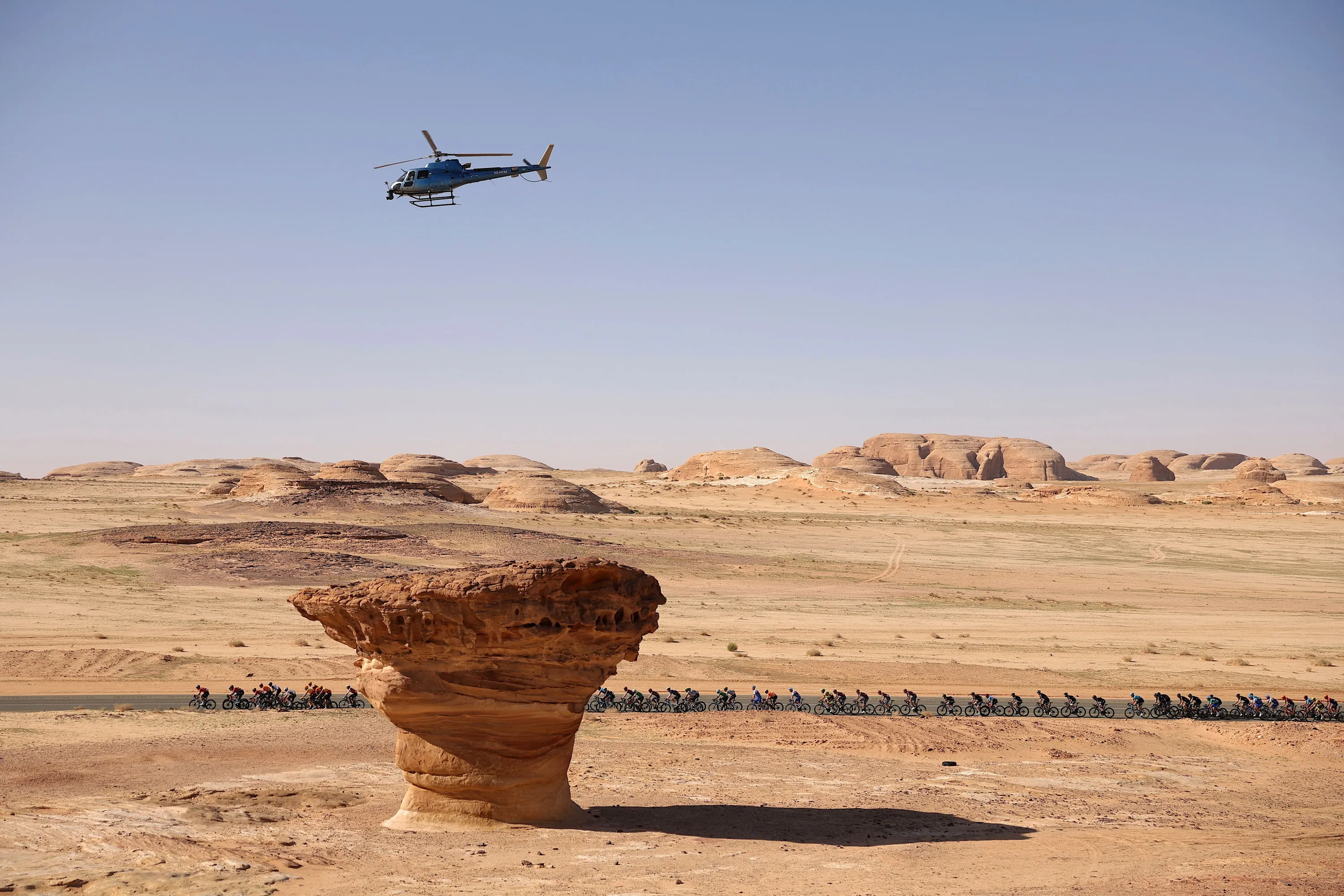 The pack rides during the second stage of 2023 Saudi Tour, from Winter Park to Shalal Sijlyat Rocks, on January 31, 2023. (Photo by Thomas Samson/AFP Photo)