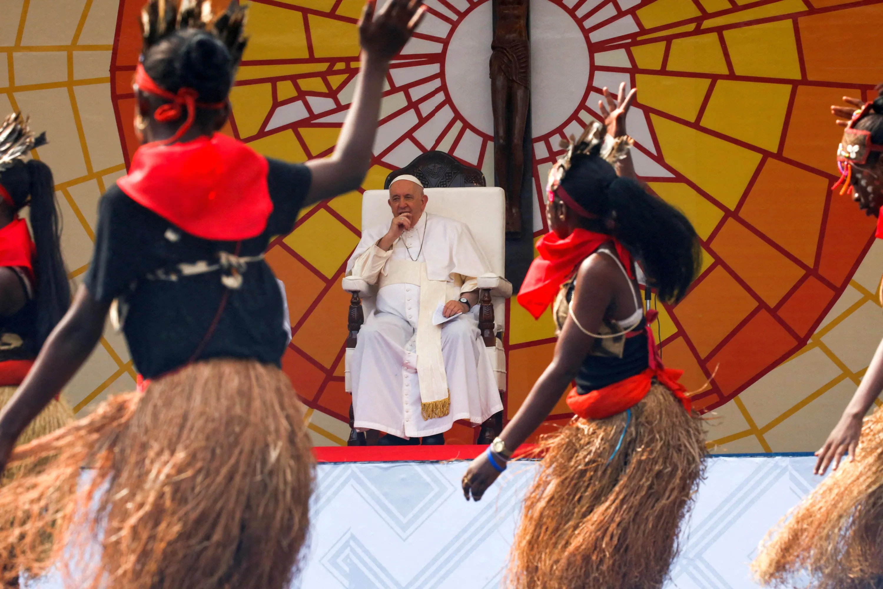 Pope Francis watches a performance as he attends a meeting with young people and catechists at the Stade des Martyrs during his apostolic journey, in Kinshasa, Democratic Republic of Congo on February 2, 2023. (Photo by Luc Gnago/Reuters)