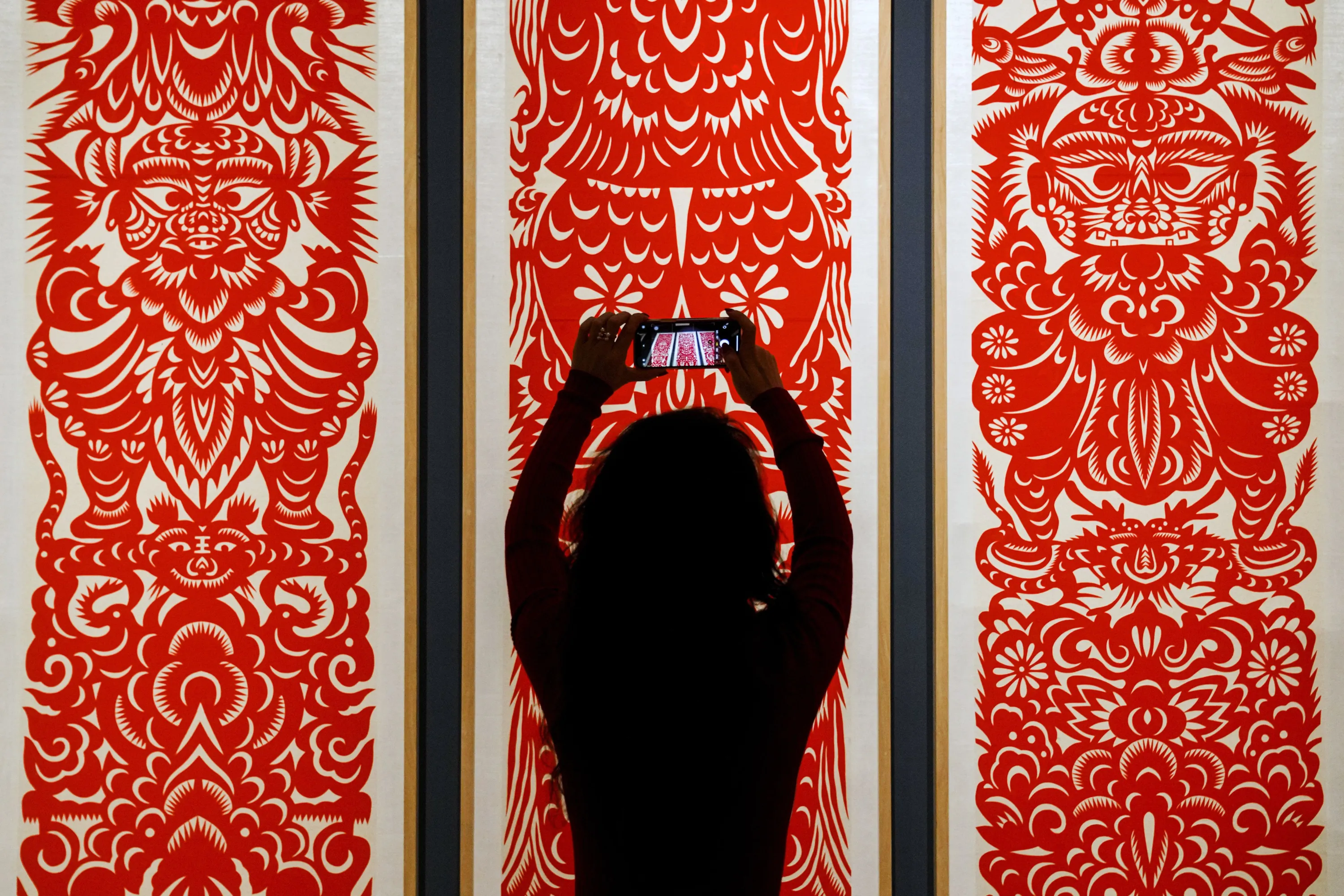 A woman takes a smartphone photo of the Chinese traditional paper cutting arts exhibited at the Beijing Art and Craft Museum during the Lunar New Year celebrations in Beijing, Sunday, January 29, 2023. Chinese people are enjoying a week-long holiday for the Lunar New Year and visiting various temple fairs and exhibitions held in the cities around China. (Photo by Andy Wong/AP Photo)