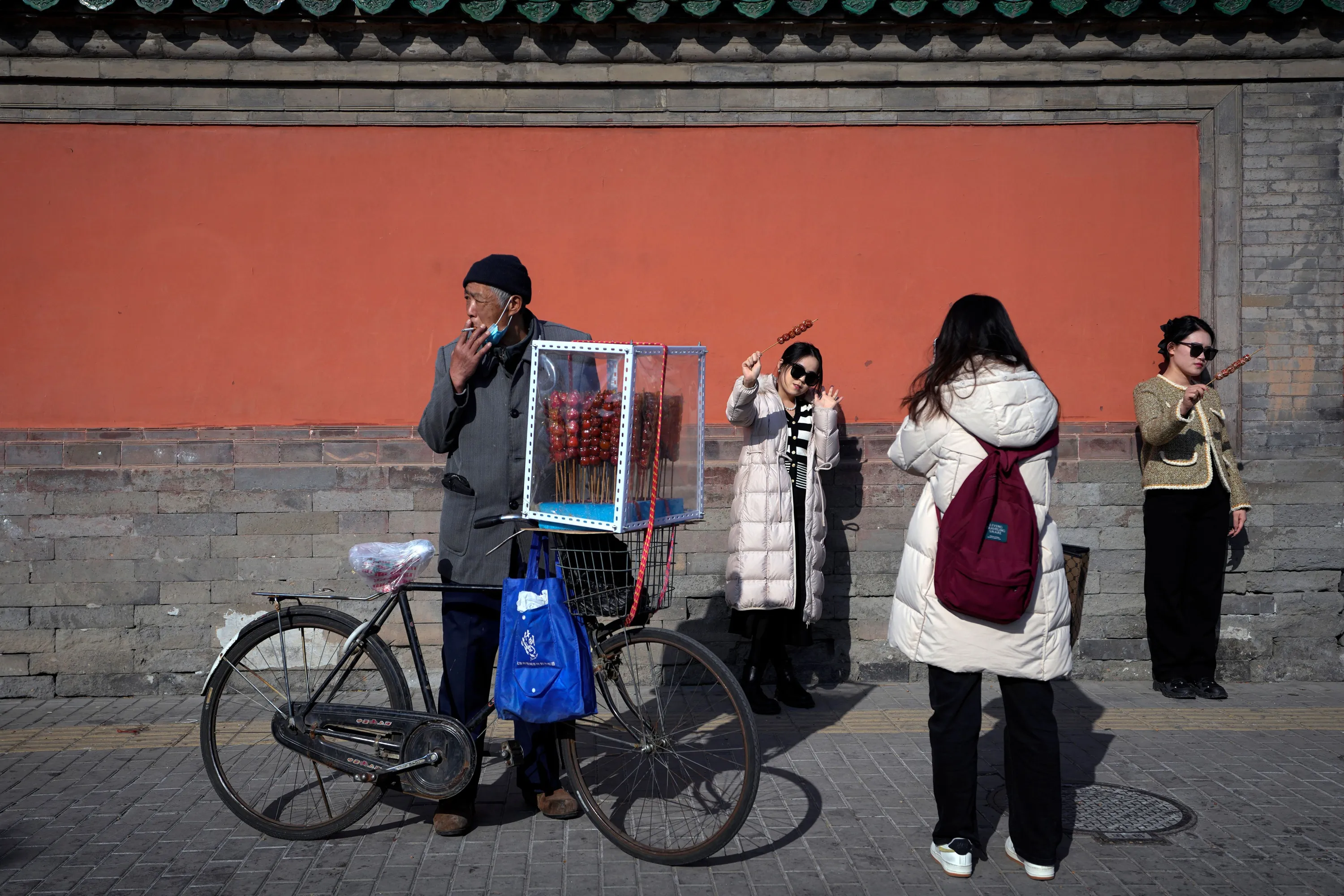 A vendor selling sugar-coated Chinese haws on his bicycle as visitors pose for photos with their purchased sugar-coated haws outside the Drum Tower in Beijing, Monday, January 30, 2023. Chinese people are enjoying the Lunar New Year and visiting various tourist sites in cities around China following the lifting last month of draconian COVID-19 restrictions, allowing a return to many aspects of normal life. (Photo by Andy Wong/AP Photo)