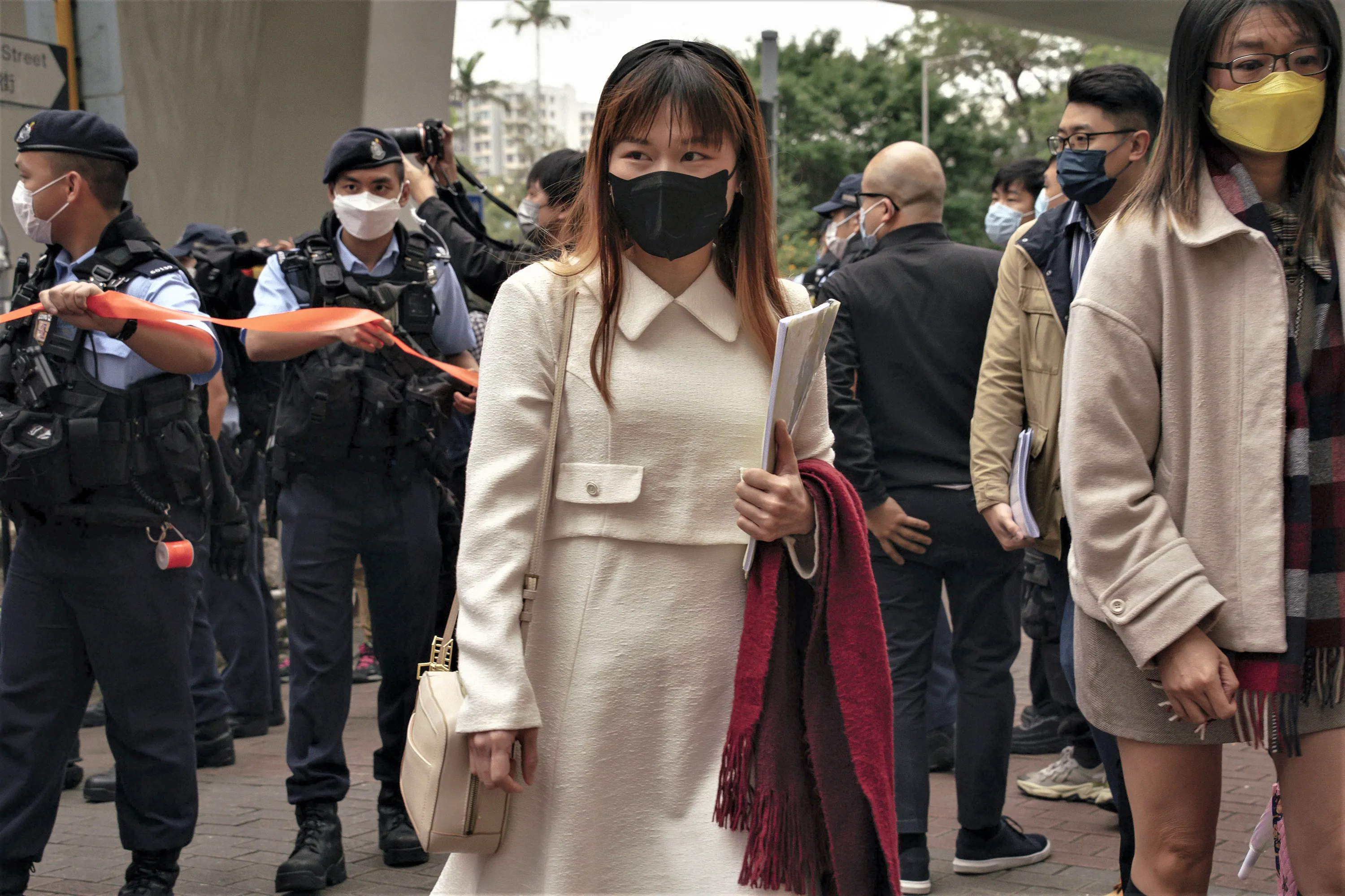 Pro-democracy activist Clarisse Yeung Suet-ying, center, arrives at the West Kowloon Magistrates' Courts to attend her national security trial in Hong Kong, Monday, February 6, 2023. Some of Hong Kong's best-known pro-democracy activists went on trial Monday in the biggest prosecution yet under a law imposed by China's ruling Communist Party to crush dissent. (Photo by Anthony Kwan/AP Photo)