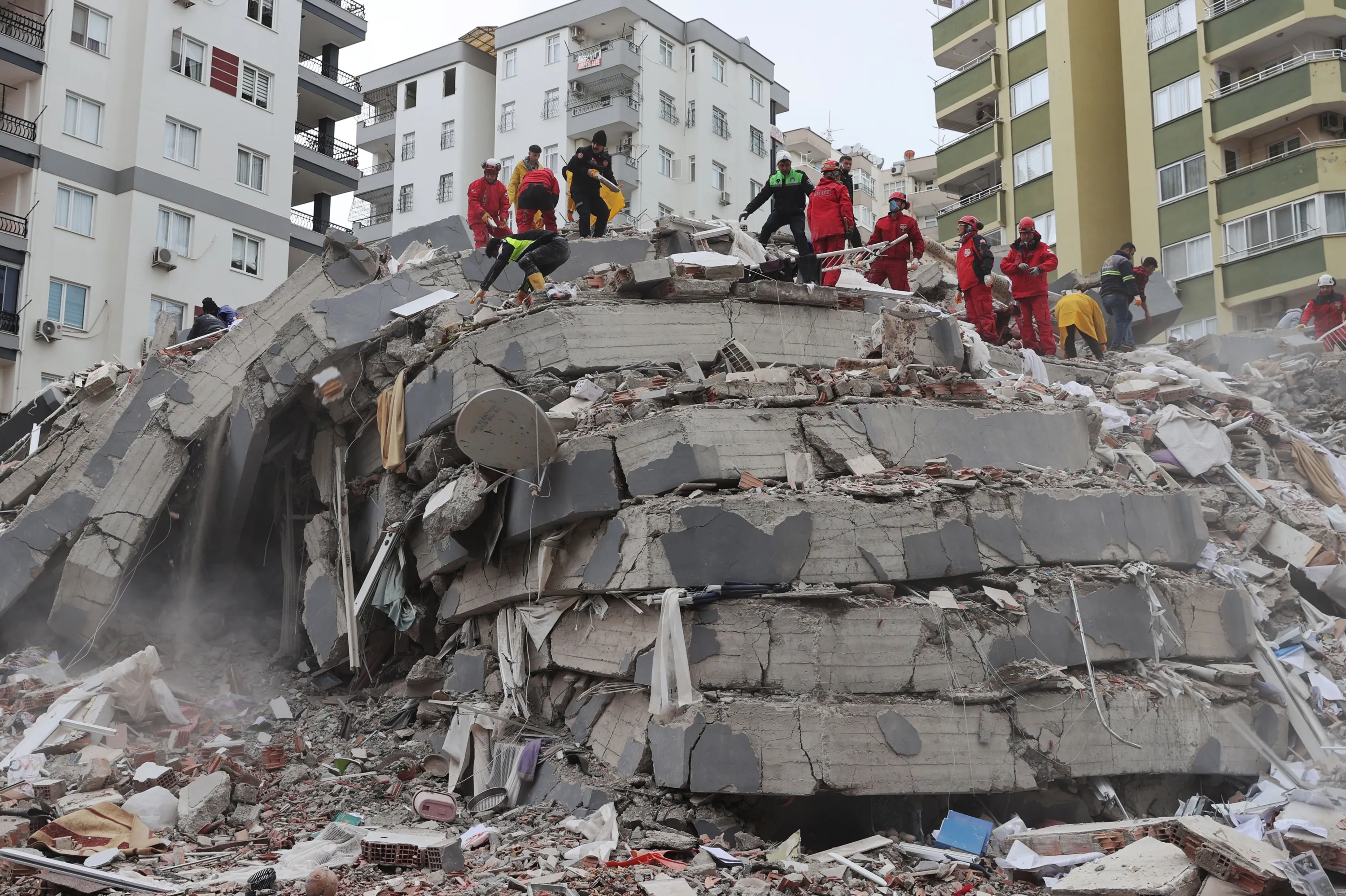 Personnel conduct search and rescue operations in Adana, Turkiye after 7.7 and 7.6 magnitude earthquakes hits Turkiye's Kahramanmaras, on February 06, 2023. Disaster and Emergency Management Authority (AFAD) of Turkiye said the 7.7 magnitude quake struck at 4.17 a.m. (0117GMT) and was centered in the Pazarcik district and 7.6 magnitude quake struck in Elbistan district in the province of Kahramanmaras in the south of Turkiye. Gaziantep, Sanliurfa, Diyarbakir, Adana, Adiyaman, Malatya, Osmaniye, Hatay, and Kilis provinces are heavily affected by the earthquakes. (Photo by Oguz Yeter/Anadolu Agency via Getty Images)