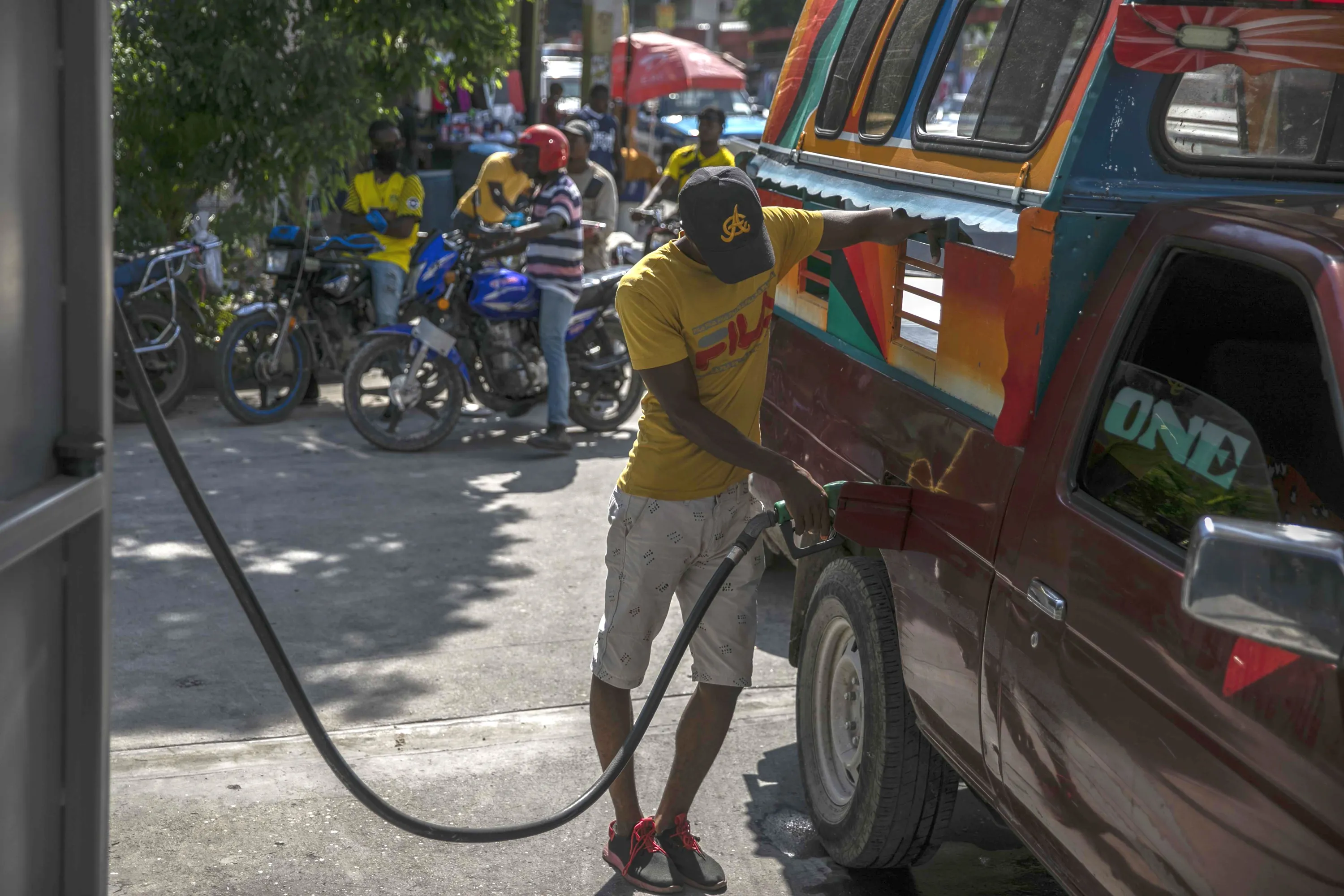 A man fills his tank at a gas station in Port-au-Prince, Haiti, Saturday, November 12, 2022. Whoops of excitement echoed through the streets of Port-au-Prince early Saturday as gas stations opened across Haiti for the first time in two months after a powerful gang lifted a crippling fuel blockade. (Photo by Joseph Odelyn/AP Photo)