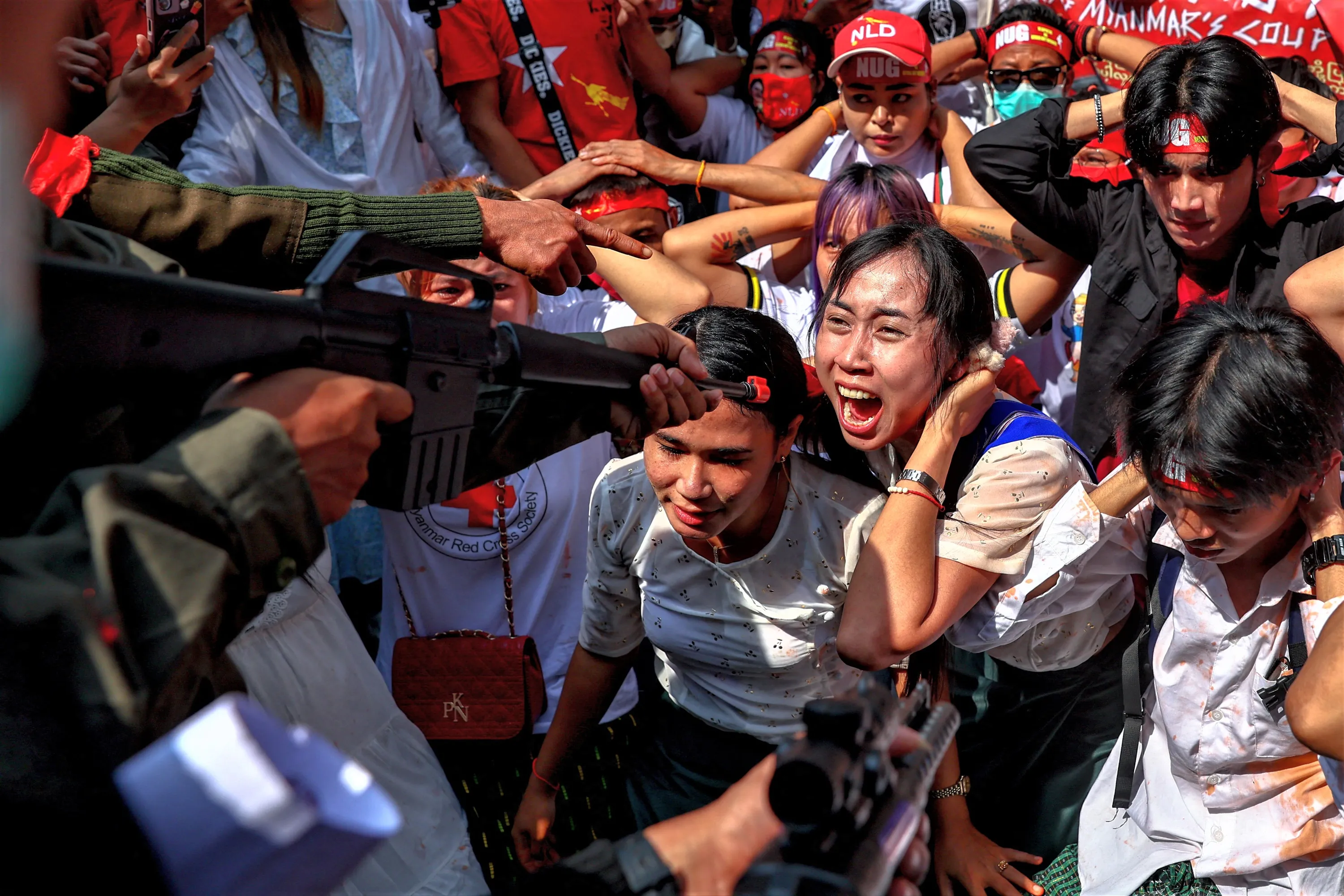Protesters perform during a demonstration to mark the second anniversary of Myanmar's 2021 military coup, outside the Embassy of Myanmar in Bangkok, Thailand on February 1, 2023. (Photo by Athit Perawongmetha/Reuters)