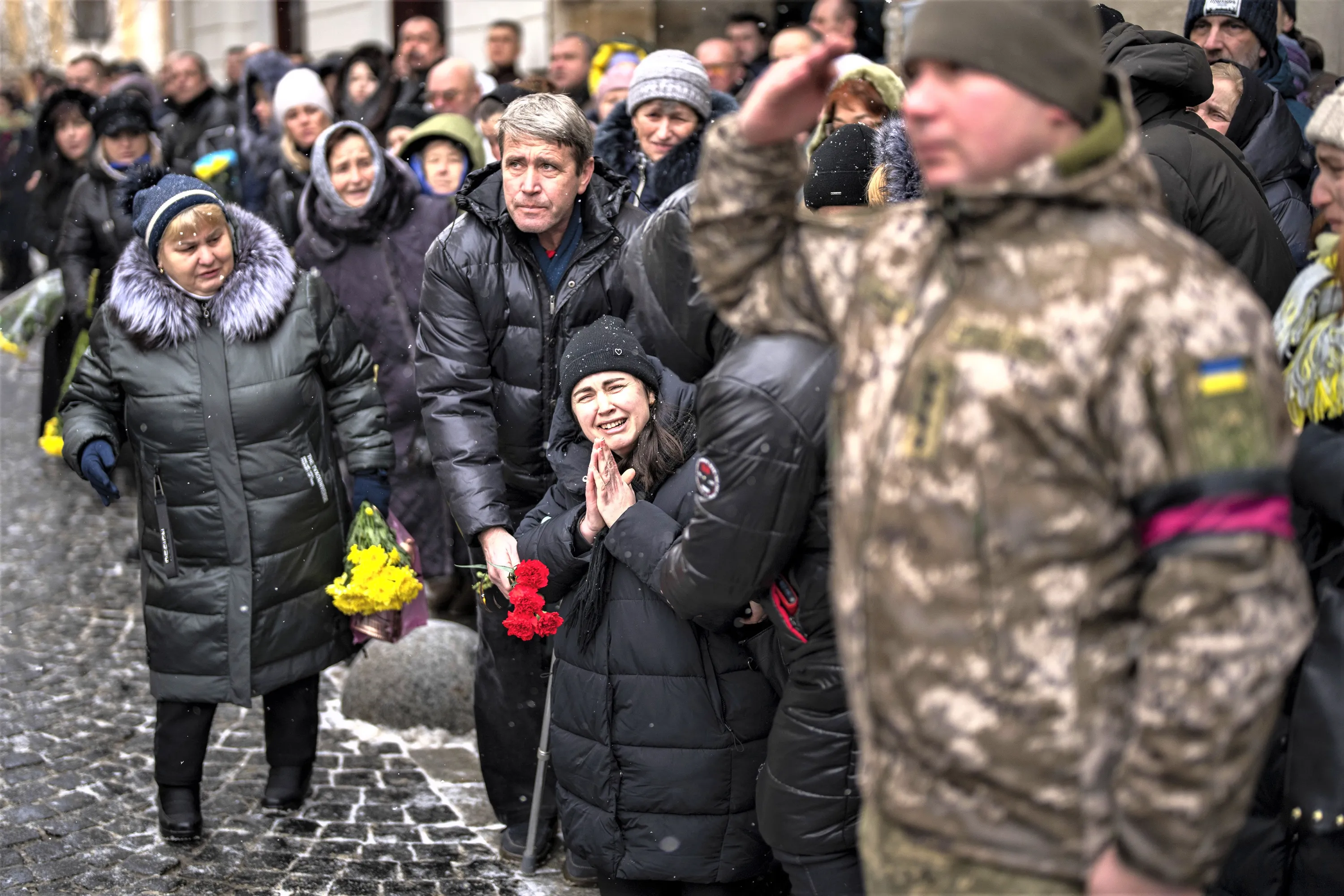 Anastasia, center, cries as soldiers carry the coffin of her brother Oleg Kunynets, a Ukrainian military servicemen who were killed in the east of the country, during his funeral in Lviv, Ukraine, Tuesday, February 7, 2023. (Photo by Emilio Morenatti/AP Photo)