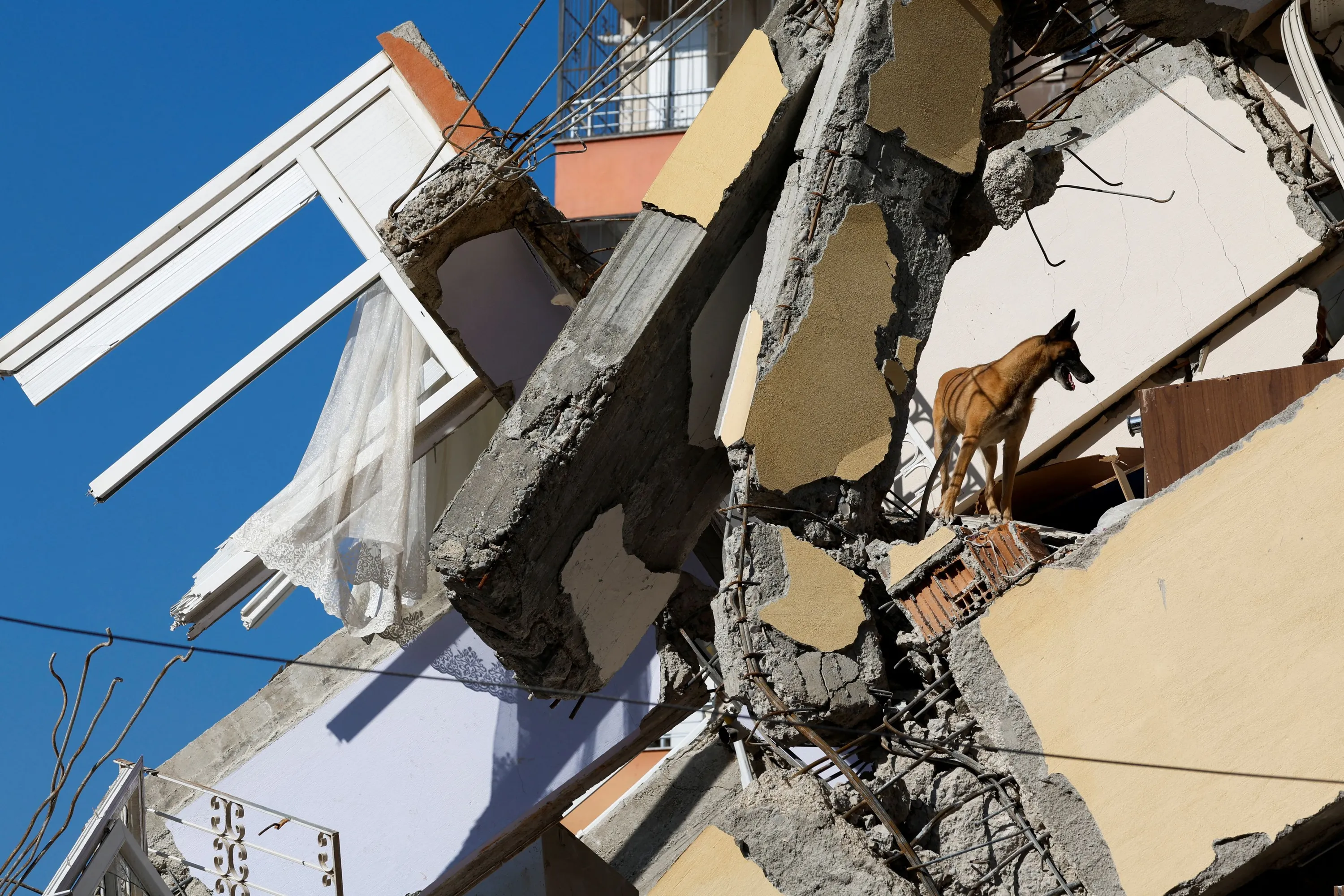 A rescue dog named Hope from International Search and Rescue (ISAR) Germany searches for survivors in the debris of a building, in the aftermath of an earthquake, in Kirikhan, Turkey on February 8, 2023. (Photo by Piroschka van de Wouw/Reuters)