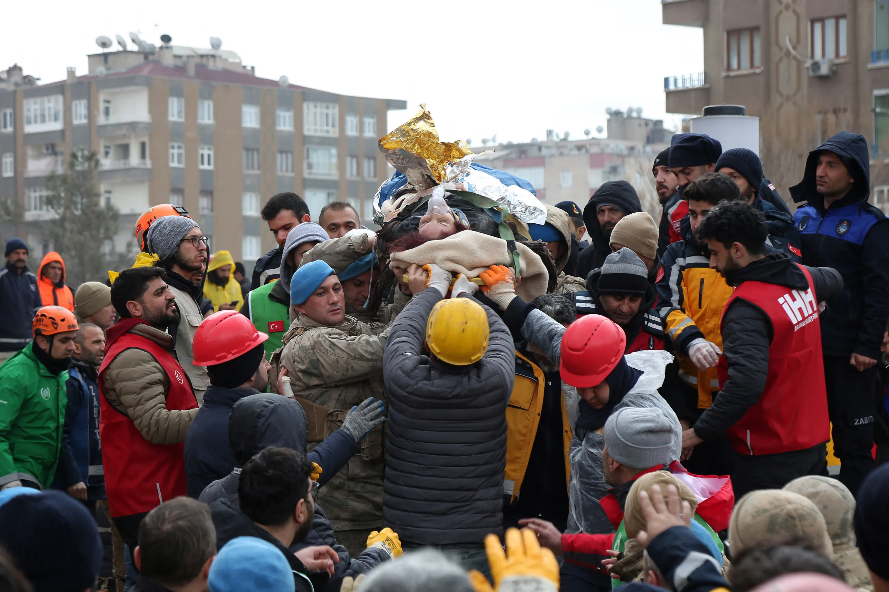 Zeynep Atesogullari is carried out by rescuers from the site of a damaged building, following an earthquake in Diyarbakir, Turkey on February 7, 2023. (Photo by Sertac Kayar/Reuters)
