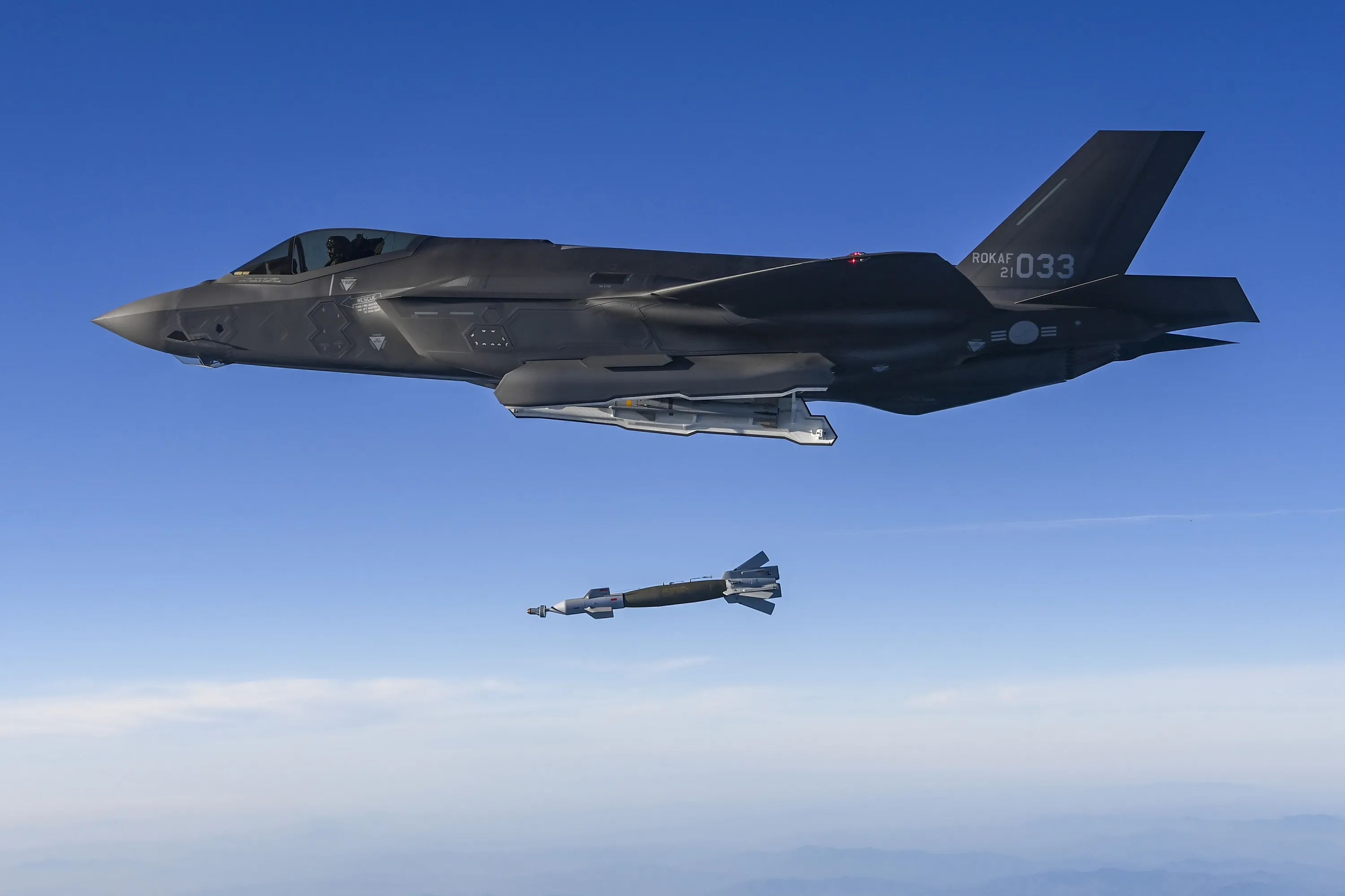 In this photo provided by South Korean Defense Ministry, South Korean Air Force F-35 fighter jet fires a GBU-12 aerial laser-guided bomb at a firing range near its land border with North Korea, South Korea, Friday, November 18, 2022. South Korea's military said Friday its F-35 fighter jets conducted drills simulating aerial strikes on North Korean mobile missile launchers at a firing range near its land border with North Korea. It said a group of eight South Korean and U.S. fighter jets separately performed flight training off the Korean Peninsula's east coast. (Photo by South Korean Defense Ministry via AP Photo)