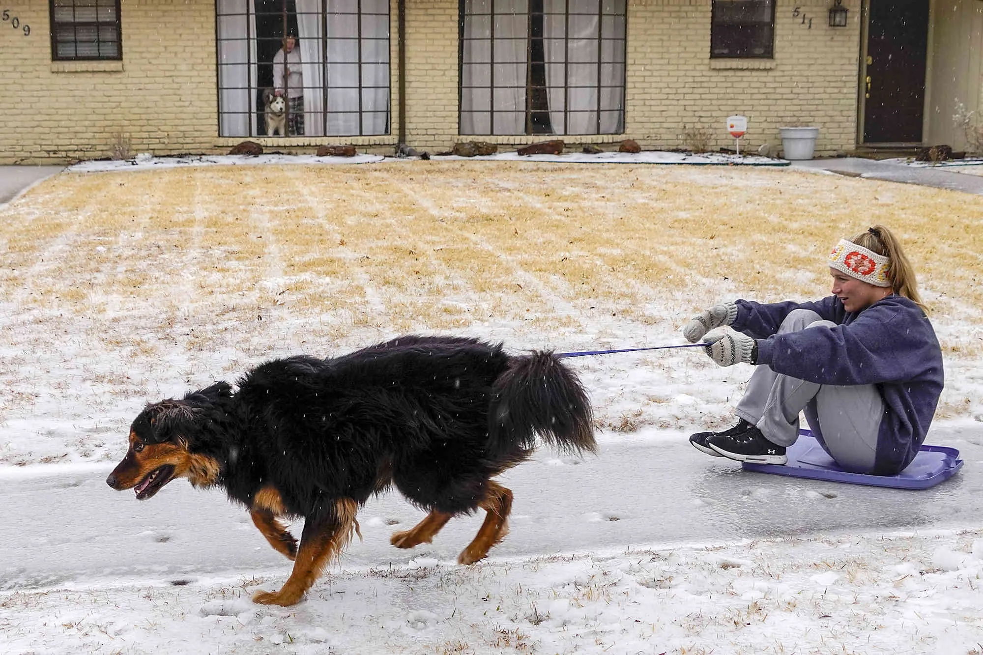 Kelsey Vining sleds down an icy sidewalk while getting a pull from family dog Mr. Riggins on Wednesday, February 1, 2023, in Richardson, Texas. Dallas and other parts of North Texas are under a winter storm warning through Thursday. (Photo by Smiley N. Pool/The Dallas Morning News via AP Photo)