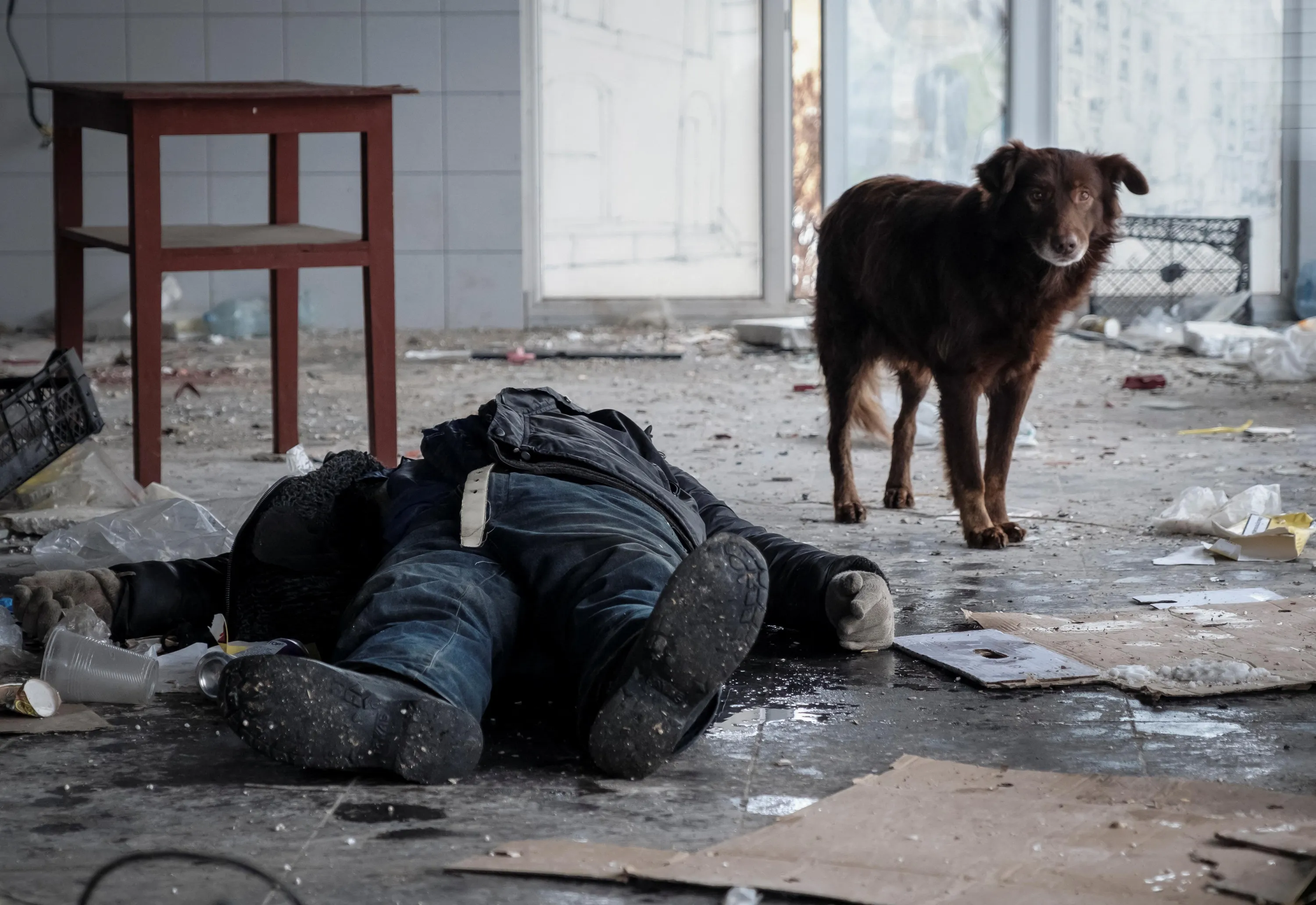 A dog stands near a body inside a damaged building, amid Russia's attack on Ukraine, in Bakhmut, Donetsk region, Ukraine on February 2, 2023. (Photo by Reuters/Stringer)
