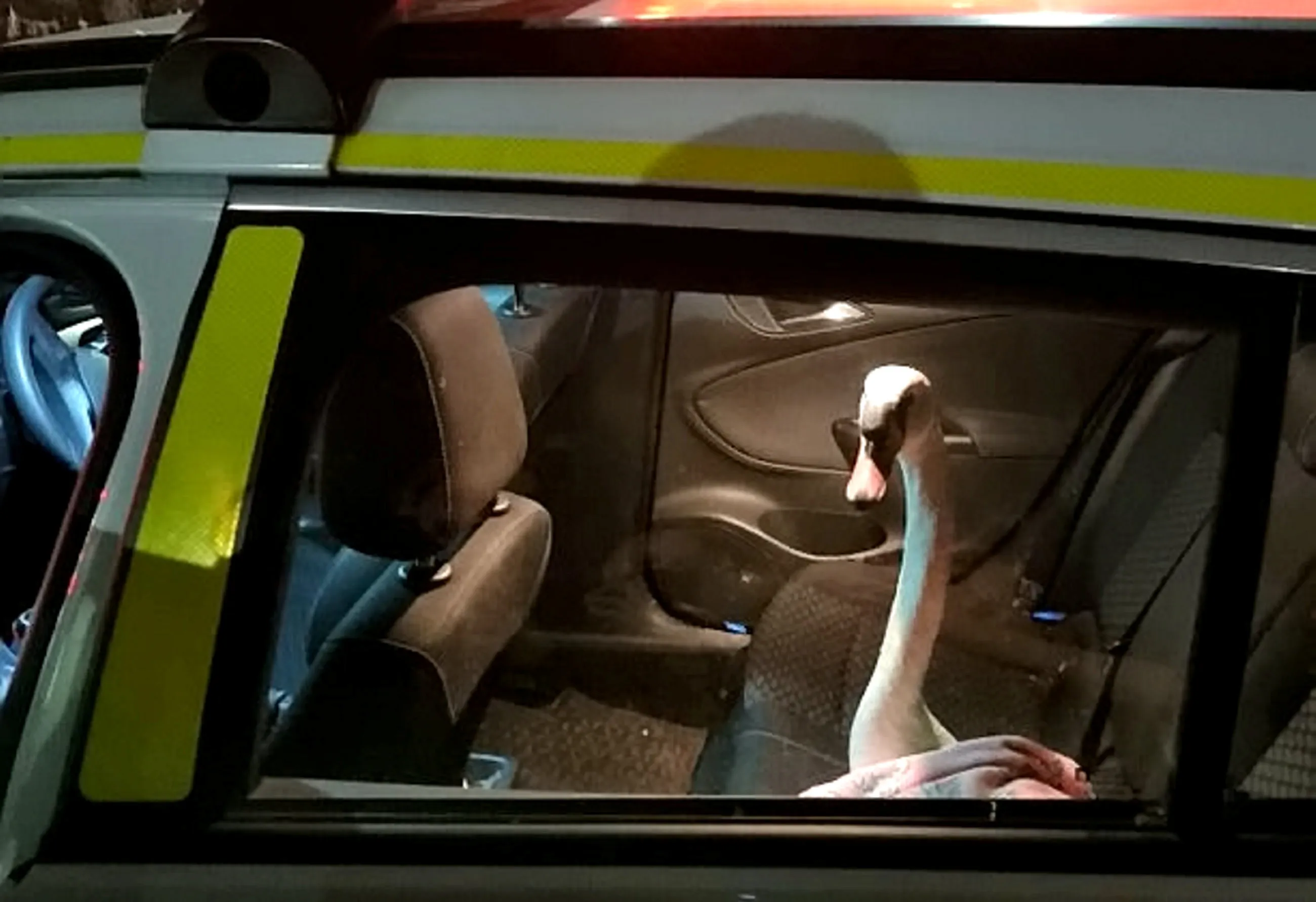 A swan that was causing chaos at Plymouth harbour had to be rescued and put in the back of a police car on February 2, 2023. The bird was spotted waddling around the area, where it was reportedly removed by a drunk man yesterday (February 1). Officers from Devon and Cornwall Police on Twitter said the swan was then involved in a collision on Mutley Plain. After this, officers placed it in the back of the car. (Photo by Plymouth Police/South West News Service)