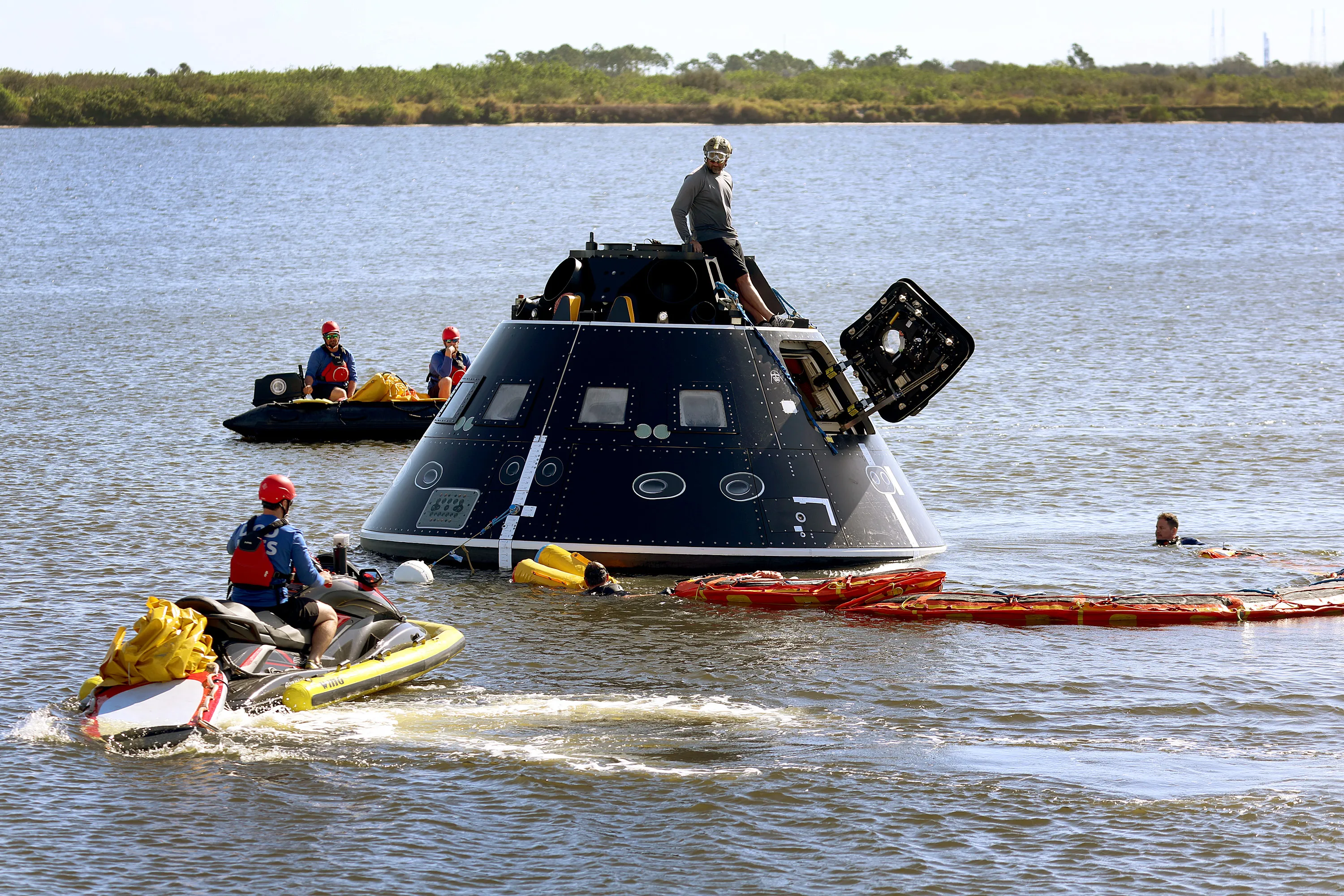 Members of the US Navy and NASA Landing and Recovery Team practice retrieving astronauts from a test version of the Orion capsule on February 06, 2023 in Cape Canaveral, Florida. The recovery team is conducting the tests for when the Orion spacecraft splashes down in the Pacific Ocean starting with the Artemis II mission possibly in 2024. (Photo by Joe Raedle/Getty Images)